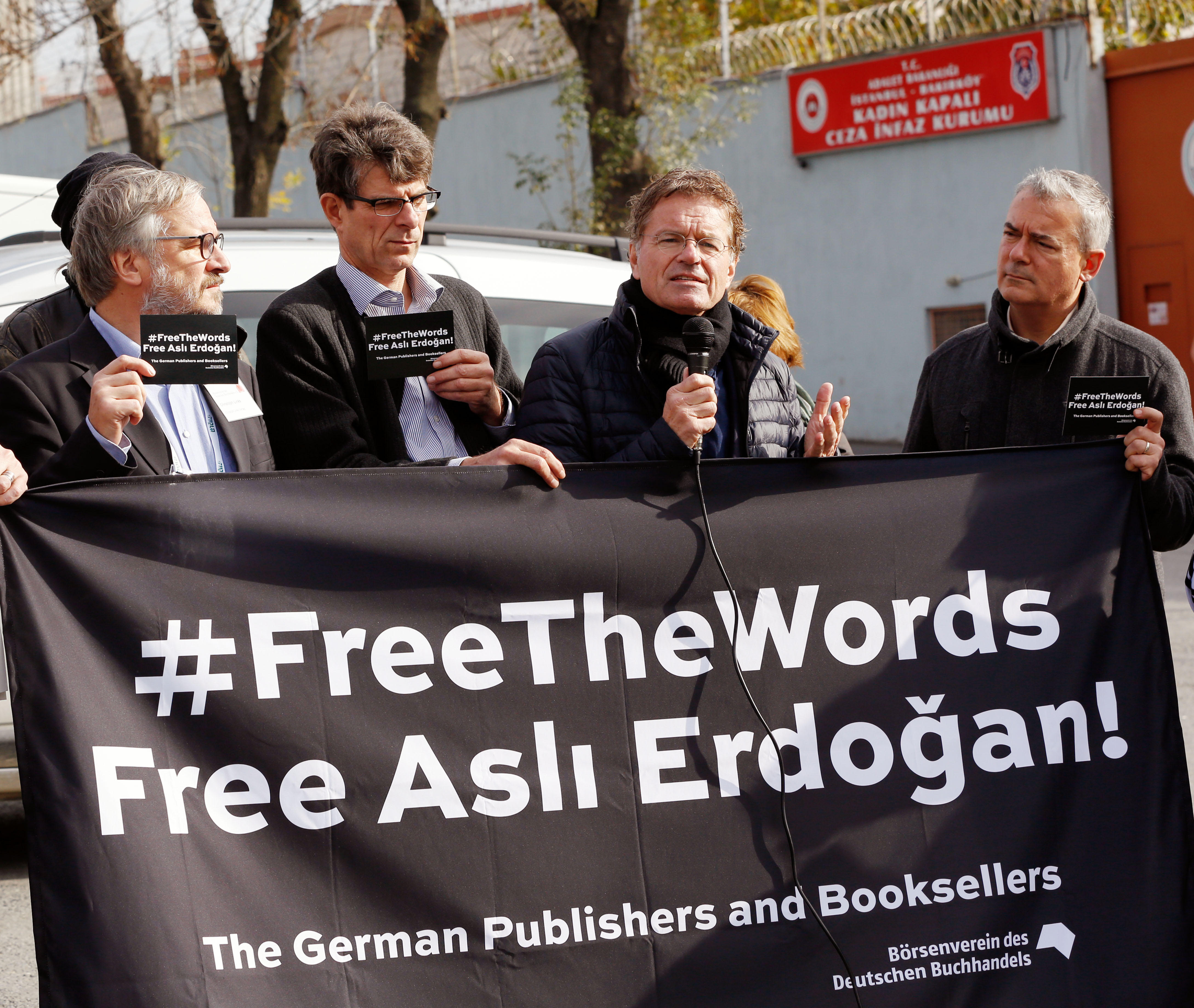 Der Börsenverein hat sich seit der Verhaftung von Aslı Erdoğan 2016 für die Freilassung der Autorin eingesetzt. Im November 2016 organisierte der Börsenverein eine Mahnwache Medien- und Kulturschaffender vor dem Istanbuler Gefängnis, in dem die Autorin inhaftiert war. Nach ihrer Freilassung aus der Untersuchungshaft setzte sich der Börsenverein mit Partnern für eine Ausreiseerlaubnis von Aslı Erdoğan ein. Kurz vor der Verleihung des Erich-Maria-Remarque-Friedenspreises der Stadt Osnabrück durfte die Autorin schließlich ausreisen und konnte an der Preisverleihung teilnehmen, bei der Alexander Skipis die Laudatio hielt. Von Oktober 2017 bis September 2019 war Aslı Erdoğan Gastautorin des Programms „Stadt der Zuflucht“ in Frankfurt, das von der Frankfurter Buchmesse und der Stadt Frankfurt organisiert wird.
