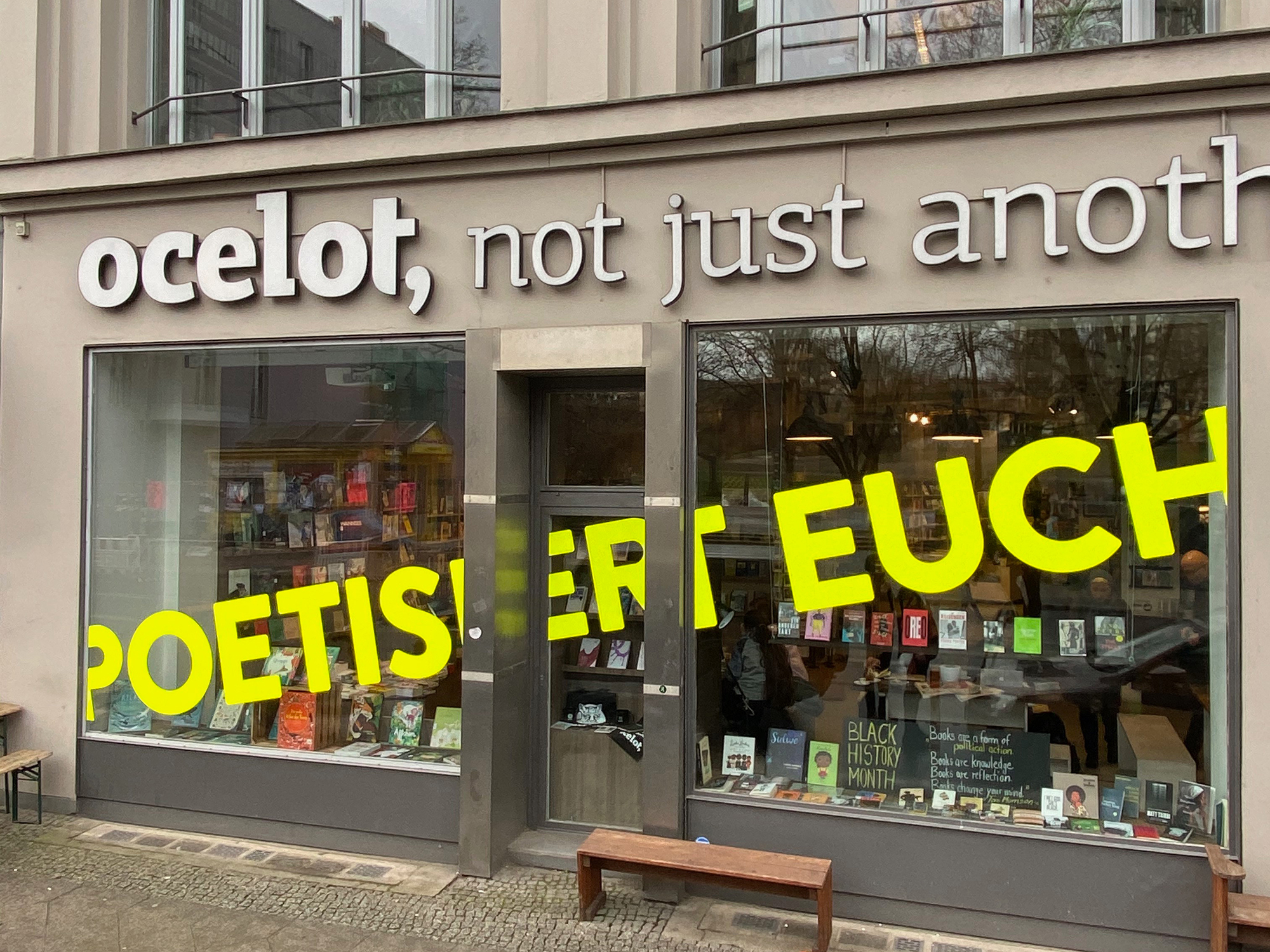 Damit hat die Berliner Buchhandlung ocelot, not just another bookstore (Brunnenstraße 181, 10119 Berlin) garantiert immer jeweils ein Exemplar aller Bücher von der Backlist des Verlagshauses Berlin vorrätig. Zum Auftakt hat die Buchhandlung all ihre Schaufenster dem Motto des Verlagshauses "Poetisiert Euch.“ gewidmet.