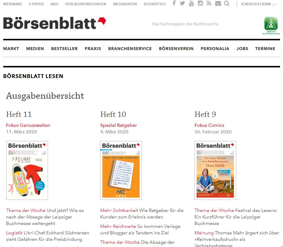 Trotz Coronavirus auf dem Laufenden bleiben: Das Fachmagazin Börsenblatt des Technologie- und Informationsanbieters MVB stellt die Inhalte seiner gedruckten Ausgabe über das E-Paper-Format zur kostenlosen Nutzung ins Netz. Das Angebot beinhaltet auch die im März bereits erschienenen Ausgaben und läuft nach derzeitigem Stand bis Ausgabe 16-2020. Bestehende Abos werden automatisch um den Aktionszeitraum verlängert. Die Registrierung ist ab sofort unter www.boersenblatt.net/epaper möglich – erforderlich sind nur die Angabe einer E-Mail-Adresse und die Vergabe eines Passworts, die Freischaltung erfolgt direkt. Die E-Paper-Ausgabe des Börsenblatts erscheint in der Regel mittwochs gegen 17:00 Uhr.