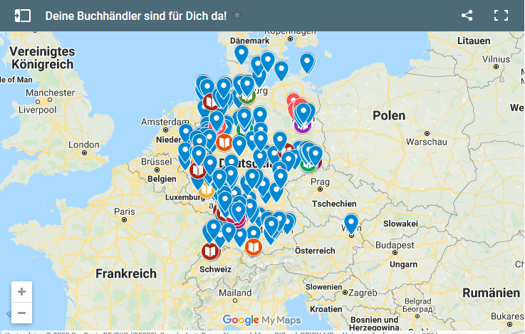Der Carlsen Verlag bietet seit heute einen Buchhandlungsfinder an: Buchhandlungen aus dem gesamten Bundesgebiet können sich in die interaktive Karte eintragen und Informationen über ihren aktuellen Service. Damit können Buchhandelskund*innen schnell herausfinden, wo sich die nächstgelegene Buchhandlung befindet, wie bestellt werden kann und ob geliefert wird oder eine Abholmöglichkeit eingerichtet ist.
