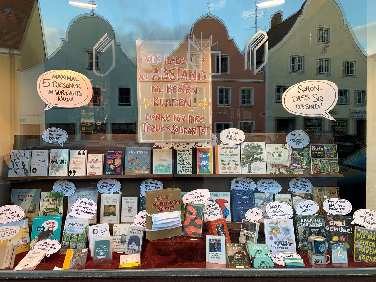 Mit Witz und Kreativität lässt sich die Corona-Krise besser ertragen: Barbaras Bücherstube in Moosburg verbindet die Hygiene-Vorschriften mit einem großen Lob an die Kunden und aktuellen Buchtipps. Das Ergebnis: ein Schaufenster, vor dem alle gern stehen bleiben.