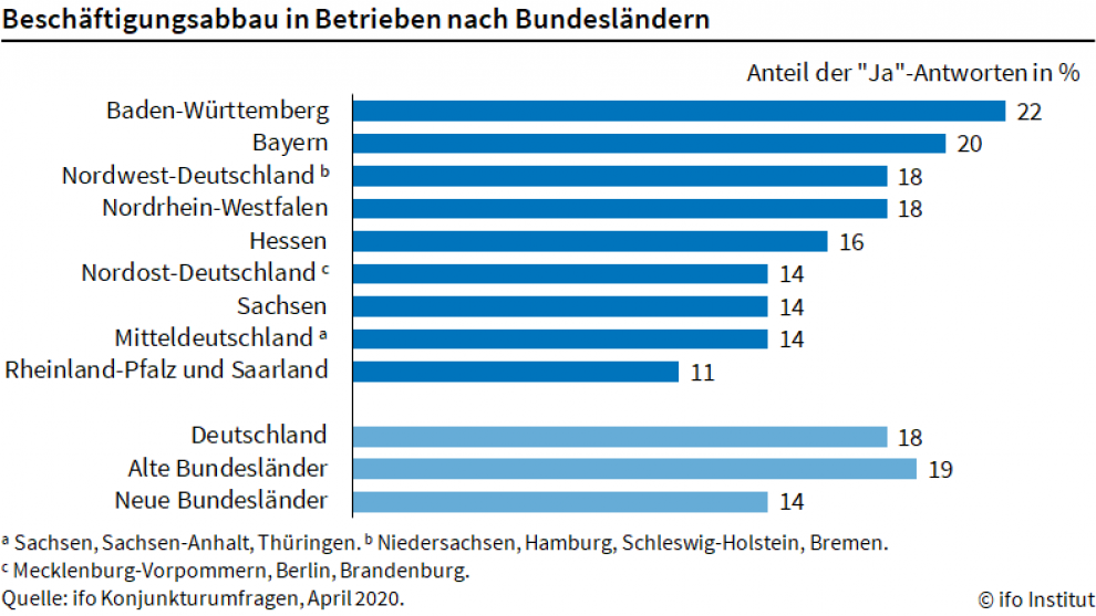 Die Coronakrise wird in vielen Branchen Jobs kosten. Das ergibt sich aus der Konjukturumfrage des ifo Instituts. Davon sind einige Branchen und Bundesländer viel stärker betroffen als andere. Im Schnitt haben 18 Prozent der Betriebe in Deutschland Arbeitsplätze gestrichen. Auch Druckereien, das Verlagswesen und die Musikverlage sind betroffen.