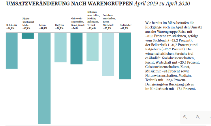 Berücksichtigt man alle Verkaufskanäle, sowohl den stationären Buchhandel wie auch Nebenmärkte und den komplettenn E-Commerce beträgt der Umsatzverlustfür den April -31,8 Prozent im Vergleich zum Vorjahresmonat. Alle Warengruppen verzeichnen einen Verlust im zweistelligen Bereich. Das Kinder- und Jugendbuch ist mit -17,4 Prozent am besten aufgestellt. Der großte Umsatzverlust verzeichnet mit einem Minus von -91,8 Prozent die Reiseliteratur.