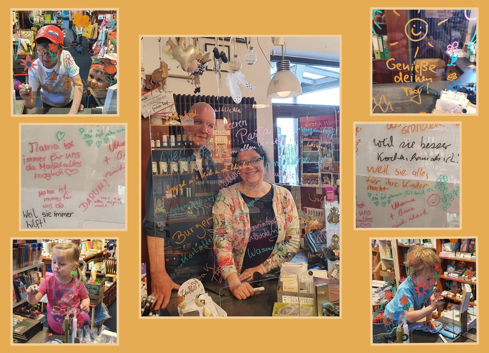 Seitdem liegen Stifte in allen Farben parat und jeder verkaufsoffene Tag steht unter einem besonderen Motto. Und jeder Kunde, ob groß oder klein, darf etwas auf die Scheibe schreiben oder malen. Von Lieblings-Büchern, Lieblings-Orten oder Lieblings-Tieren über den ersten Sitznachbarn der ersten Schulklasse bis hin zum Lieblingsgruß reicht das Themen-Angebot. Vom Lieblings-Hobby über die Lieblings-Lese-Ecke bis zum Motiv, das als Kind am liebsten gemalt wurde.