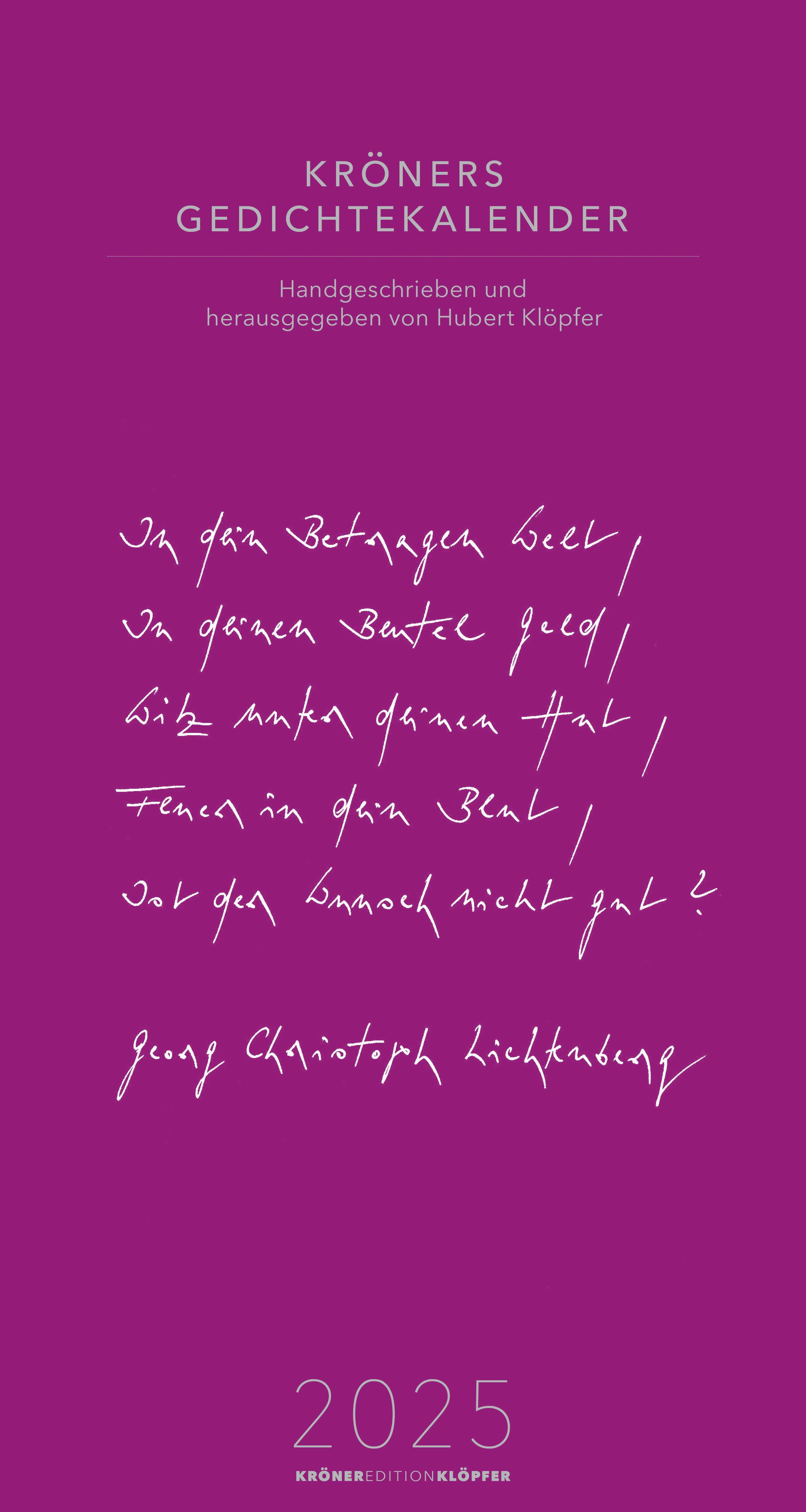 Seit 2020 erscheint der Lyrik-Kalender des Tübinger Verlegers Hubert Klöpfer im Alfred Kröner Verlag. 1 Euro pro verkauftem Exemplar von "Kröners Gedichtekalender 2025" (insgesamt 750 Euro) gehen nun als Spende an den Bundesverband Leseförderung.