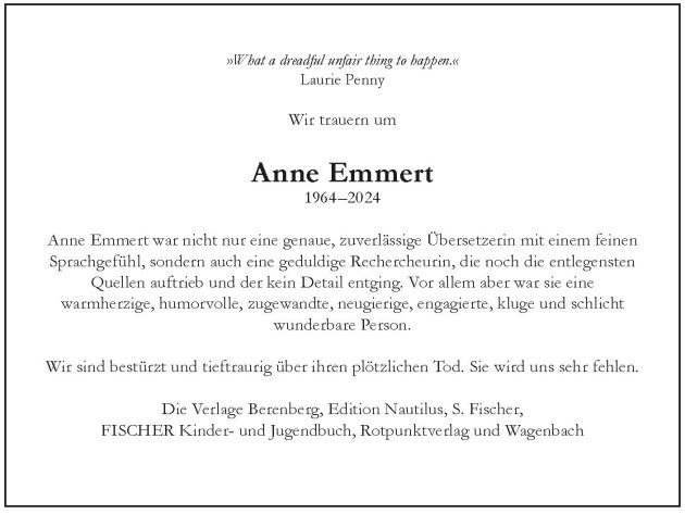 Dies teilt der Freundeskreis zur Förderung literarischer und wissenschaftlicher Übersetzungen e.V. mit, der Anne Emmert mit der "Rebekka" ausgezeichnet hat. Die Familie der verstorbenen Übersetzerin hatte den Freundeskreis informiert. Der Verein trauert über den Verlust der Kollegin, Freundin und Übersetzerin: "Wir sind zutiefst bestürzt, uns fehlen noch die Worte, ihrer Familie sprechen wir tiefstes Mitgefühl aus."