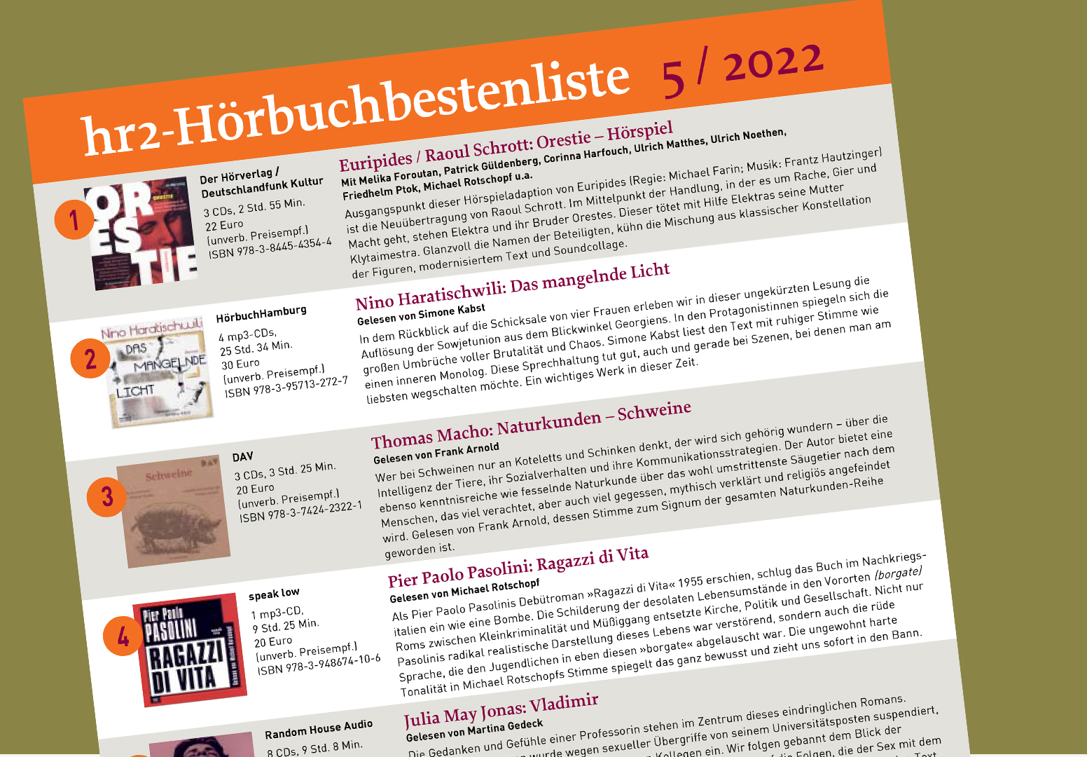 "Euripides / Raoul Schrott: Orestie – Hörspiel" als Neuübertragung des klassischen Stoffs ist als Hörspiel prominent besetzt: Mit Melika Foroutan, Patrick Güldenberg, Corinna Harfouch, Ulrich Matthes, Ulrich Noethen, Friedhelm Ptok, Michael Rotschopf u.a.