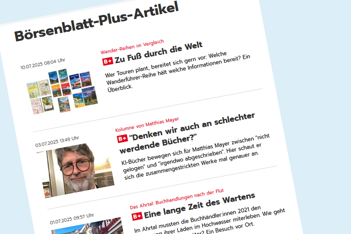 Um B+ Inhalte lesen zu können, benötigen Sie ein Benutzerkonto und ein Digital-Abo. Günstig für Mitglieder des Börsenvereins: In der Mitgliedschaft oder einem Abo ist jeweils ein kostenfreier Zugang inkludiert.
