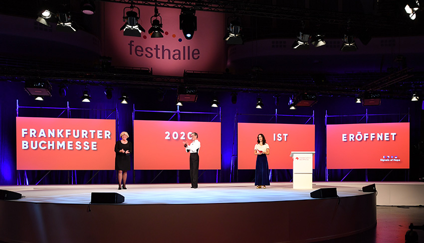 Bis vor kurzem, so meinte Kulturstaatsministerin Monika Grütters in ihrem Grußwort, „hätte man eine solche Szene wohl am ehesten bei Margaret Atwood als düstere Dystopie erwartet“. Die an diesem Abend noch häufiger zitierte kanadische Schriftstellerin, Essayistin und Dichterin, 2017 Friedenspreispreisträgerin des Deutschen Buchhandels, die der Eröffnung der 72. Frankfurter Buchmesse per ruckelfreiem Livestream beiwohnte, müsste das wohl bejahen: Die riesige, sonst Platz für 13.500 Gäste bietende Festhalle bis auf ein Häuflein Ehrengäste, Techniker und Fotografen menschenleer, vier große Videoscreens, die „Signale der Hoffnung“, so das Motto des Abends, ganz buchstäblich per Flaggenalphabet sendeten, dazu die protokollarisch ungewohnte Frage, ob die im Laufe der schmucklos choreografierten Feier als Förderin des Buches ausgezeichnete Kulturstaatsministerin Plakette und Urkunde überhaupt berühren darf? Welche Abstände sind bei maskenfreien Gruppenfotos opportun, ohne dass die Frankfurter Polizei Ordnungsgelder kassiert? Die Eröffnung der Messe erfolgte dann nicht, wie 71 Mal zuvor, per donnerndem Hammerschlag – sondern mit einem digitalen Soundteppich, der ein wenig nach Raumschiff Enterprise klang. Beam me up, Gutenberg?