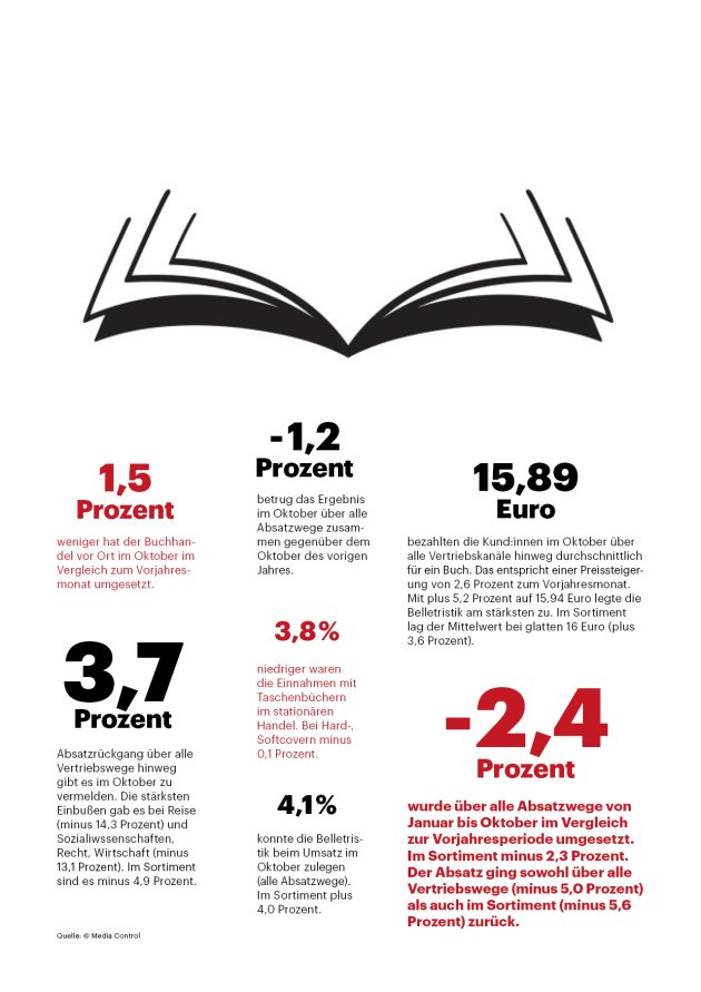 Die Umsatzentwicklung verzeichnete im Oktober sowohl für das Sortiment als auch für alle Absatzwege zusammen ein Minus – und das bei gleicher Anzahl an Verkaufstagen wie im Vorjahresmonat. Bei den Warengruppen legte allein die Belletristik zu. Das zeigt der Branchen-Monitor Buch, den Media Control im Auftrag des Börsenvereins erhebt.