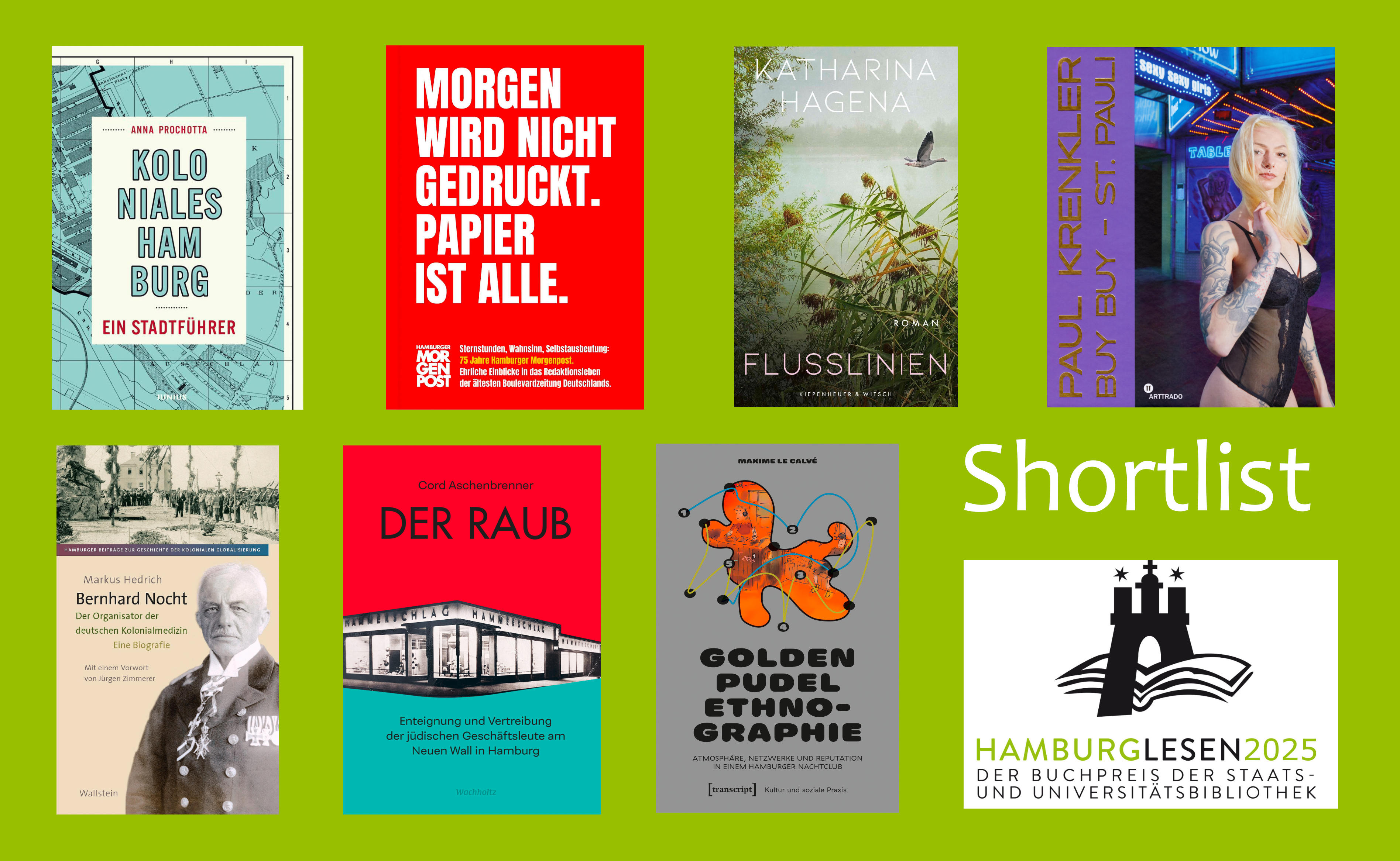 Die feierliche Preisverleihung beginnt um 17 Uhr im Lichthof der Stabi. Die Jury zeichnet mit dem genreoffenen Preis ein Buch aus, das sich in herausragender Weise mit Hamburg beschäftigt, mit der Stadt und ihrer Geschichte, ihren Menschen, ihrer Architektur, ihrer Kultur. Auf die Shortlist, die bei der Preisverleihung in kurzen Laudationes vorgestellt wird, haben es folgende sieben Titel geschafft: