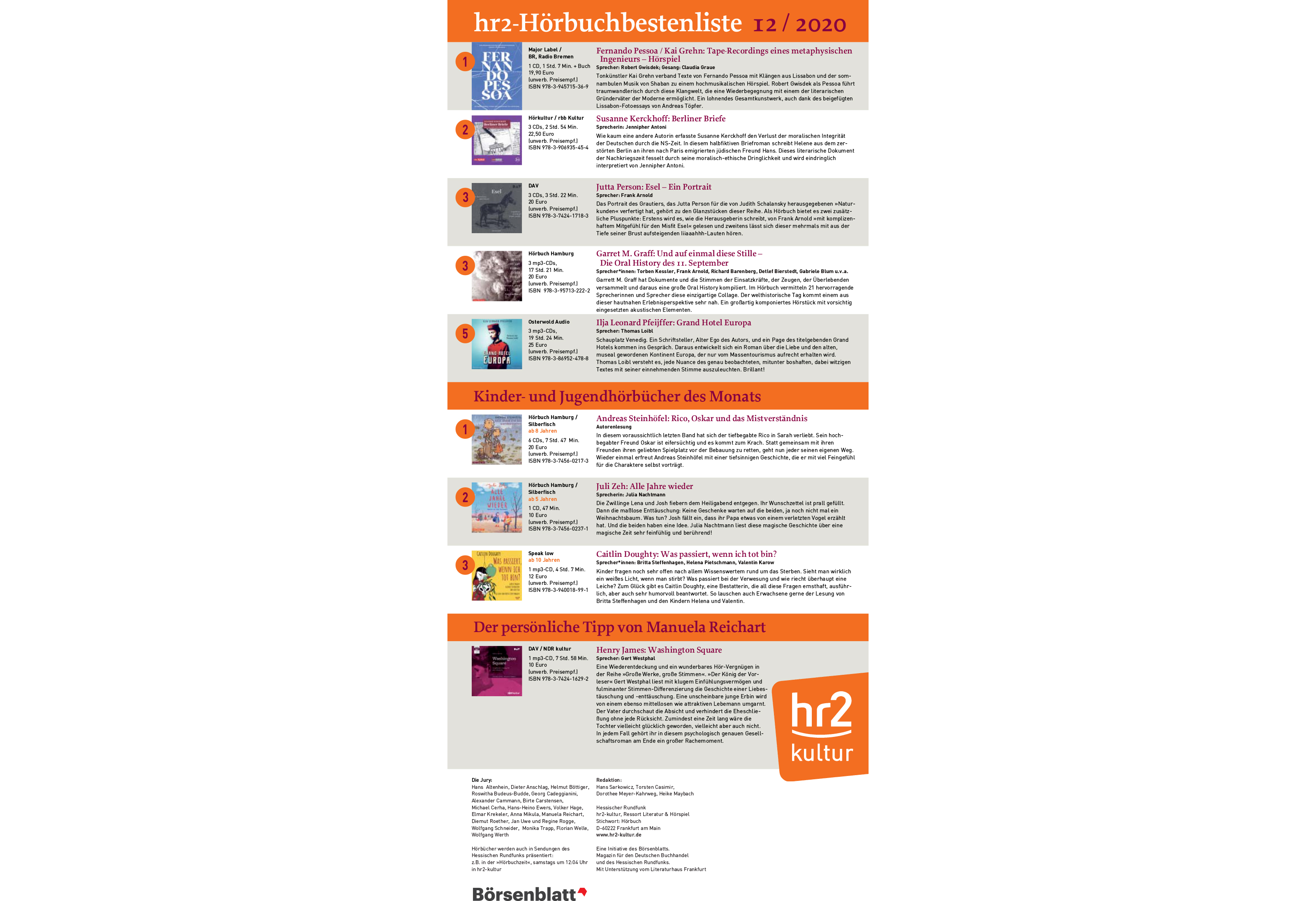 Ausführliche Beschreibungen und Bibliografien aller weiteren empfohlenen Titel in der hr2-Hörbuchbestenliste (unten als Download), Hörproben unter hr2-kultur.