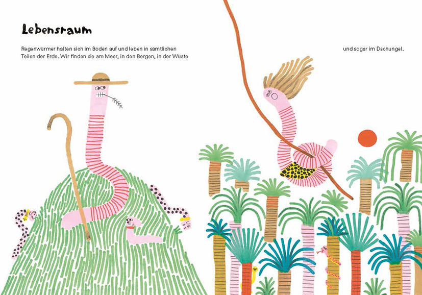 Auch wenn es weltweit rund 700 Arten gibt, sie finden sich "weder in der Literatur noch im Film, in der Musik oder Mode. Nicht einmal im Zoo sind sie geduldet", bemängelt Vola. Im Bilderbuch tauchten sie zwar in Axel Schefflers und Julia Donaldsons "Superwurm" (Beltz & Gelberg) auf oder in Jule Wellerdieks "Fundbüro Wurm" (NordSüd), aber gegenüber Bären oder Katzen sind sie klar in der Minderheit. In aktuellen Kinderbuchprogrammen holen die Würmer nun auf; Vola verweist auf Charles Darwin, der Regenwürmer erforschte und ihre Bedeutung in "Die Bildung der Ackererde durch die Tätigkeit der Würmer" beschrieb. Diese Erkenntnisse greifen Polly Owen und Gwen Millward in "Kackadiesisch! Darwins großes Regenwurm-Spektakel" (Penguin junior, Ü: Ulrike Hauswaldt) auf. Mit Illustrationen, kurzen Texten und Sprechblasen zeigen sie Kindern ab fünf Jahren, wie Darwin herausfand, dass Wurmkot perfekter Dünger ist – ein Nutzen für die Landwirtschaft.