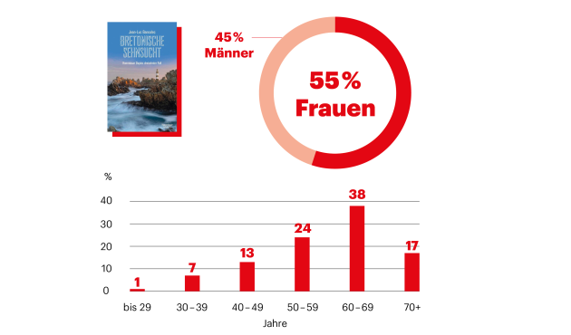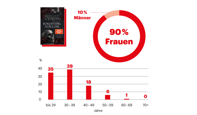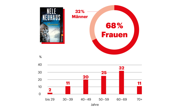 Beim Nele Neuhaus-Krimi "Monster" ist der Anteil der männlichen Käufer mit 32% (Frauen: 68%) größer als bei den beiden New-Adult-Titeln, aber geringer als bei "Bretonische Sehnsucht" von Jean-Luc Bannalec (siehe oben). Altersmäßig ist die Verteilung der Käufer:innen ähnlich wie beim Kommissar Dupin: 68% sind ab 50 Jahre alt. Der Anteil der bis 39-Jährigen macht 13% aus, bei "Bretonische Sehnsucht" sind es 8%.
