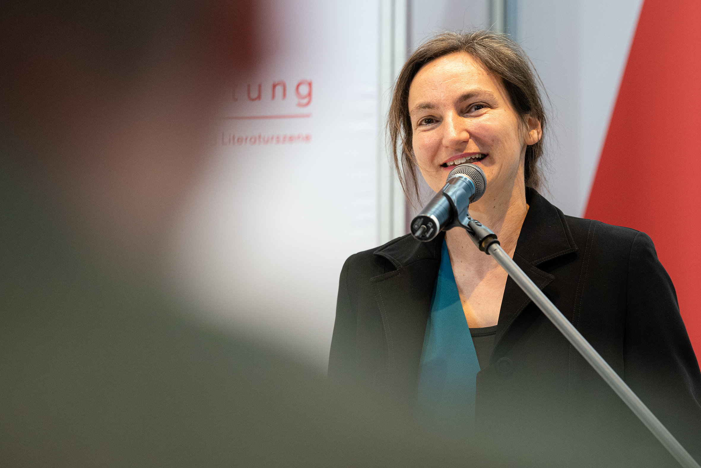 Müllers Laudatio verfolgten zahlreiche Gäste (inklusive etlicher Preisträger:innen früherer Jahre), und da die bereitgestellten Bänke rasch besetzt waren und Stehplätze ohne Sichtbehinderung rar, nahm der ein oder andere Verleger einfach auf dem Teppich Platz. So viel Lässigkeit darf auch bei einer Preisverleihung sein.