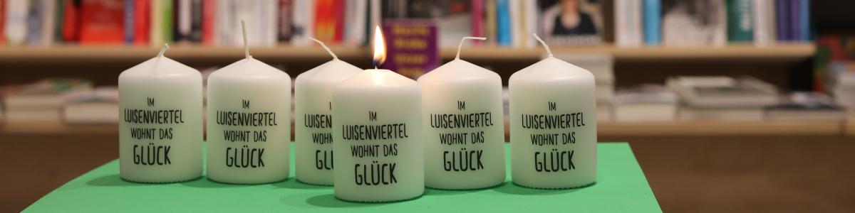 Zu Beginn des Frühlings habe man bei "Das Viertel leuchtet" Töpfe mit Narzissen verteilt, so Kozinowski, jetzt hat er sich mit einem Verlagsvertreter überlegt, schöne Kerzen zu gestalten, die regionalen Bezug haben. Die Kerze "Luisenviertel" gibt es exklusiv in der Buchhandlung, darauf steht: "Im Luisenviertel wohnt das Glück". Die Nachfrage sei groß, freut sich Kozinowski. Während der Aktion sei es immer relativ voll, der Verkauf an sich falle dabei unterschiedlich aus. "Wir machen es aber nicht für die großen Umsätze, sondern einfach, um zu zeigen, dass wir da sind."