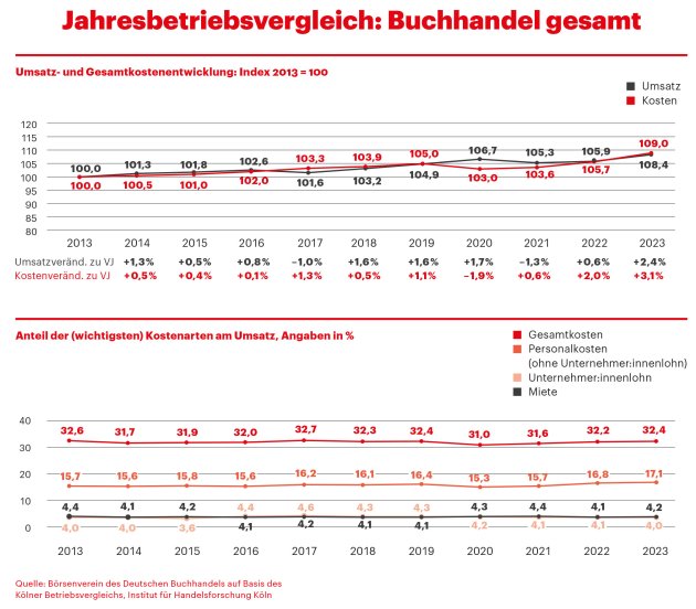 Personal, Miete, Transport, Porto und anderes mehr: Der Buchhandel ist in den vergangenen Jahren an vielen Stellen mit steigenden Kosten konfrontiert worden – ein Ende ist nicht in Sicht. Gleichzeitig wachsen die Umsätze nicht in gleichem Maße mit. Bisher wurde diese Entwicklung einmal jährlich im Betriebsvergleich des Instituts für Handelsforschung (IfH) abgebildet. Erstmals liegt nun die Kosten- und Umsatzentwicklung der vergangenen zehn Jahre im langfristigen Vergleich vor. Die Übersicht wurde von der Abteilung Marktforschung des Börsenvereins auf Grundlage des Kölner Betriebsvergleichs des IfH erstellt.