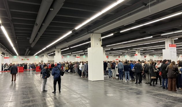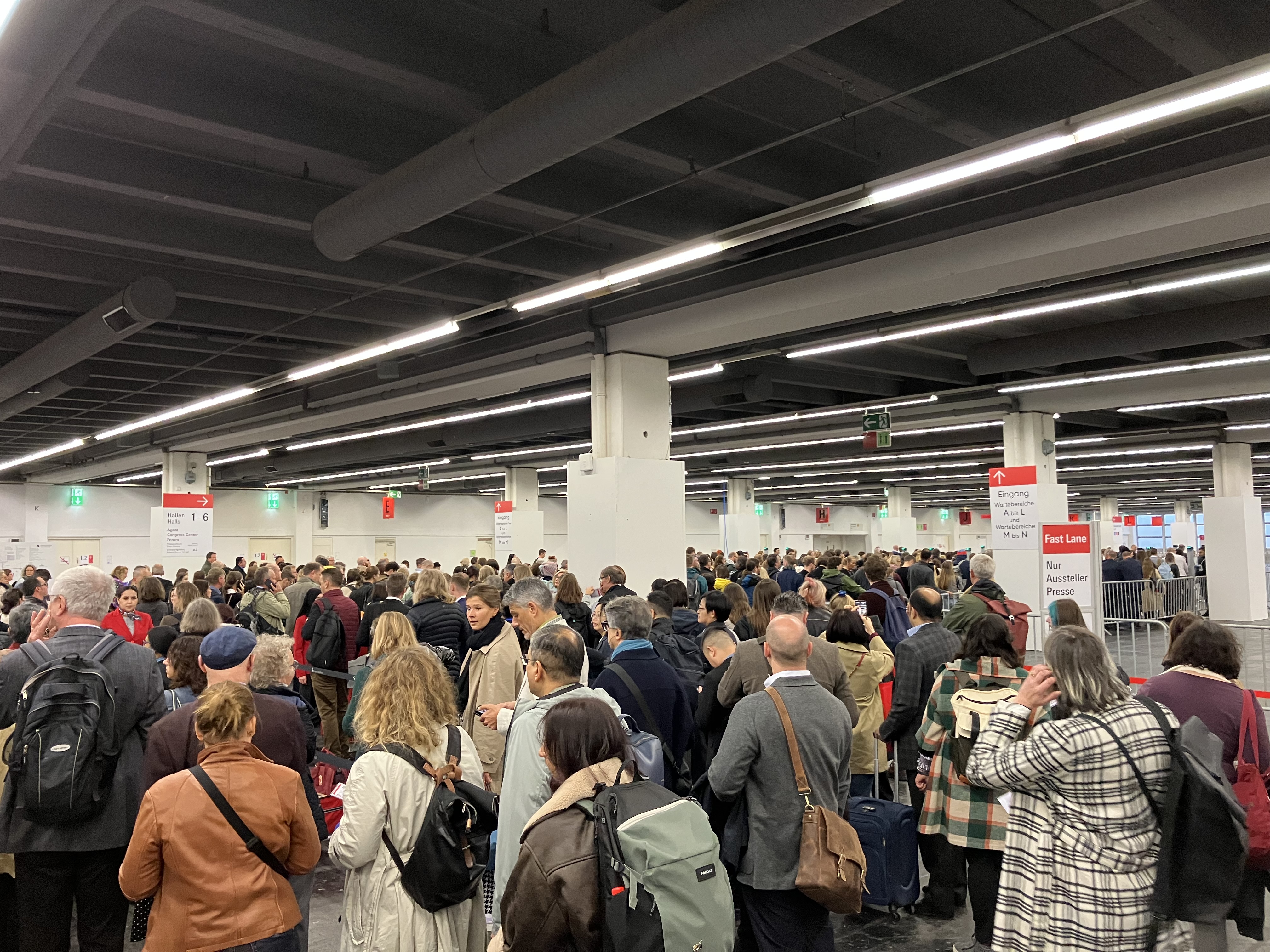 Zehn vor 9 Uhr in der Einlasshalle, Stillstand und Gedränge vor den Schaltern. Noch kein Durchkommen. Fragen kamen auf, es wurde gestöhnt ("Ei, Ei, Ei!"), sich beschwert, die Schlangen gewechselt. Muss man morgen früher kommen?, Gibt es keine Fast Lane für Aussteller?, war aus manch einer Gruppe zu hören. Man hätte sich eine Durchsage gewünscht. Aber das freundliche Personal gab Auskunft und öffnete schließlich mehr Zugangskontrollen. Dann ging es etwas zügiger. Nach dem Ticketscan wurden an einer weiteren Stelle noch die Taschen stichprobenartig durchgesehen.