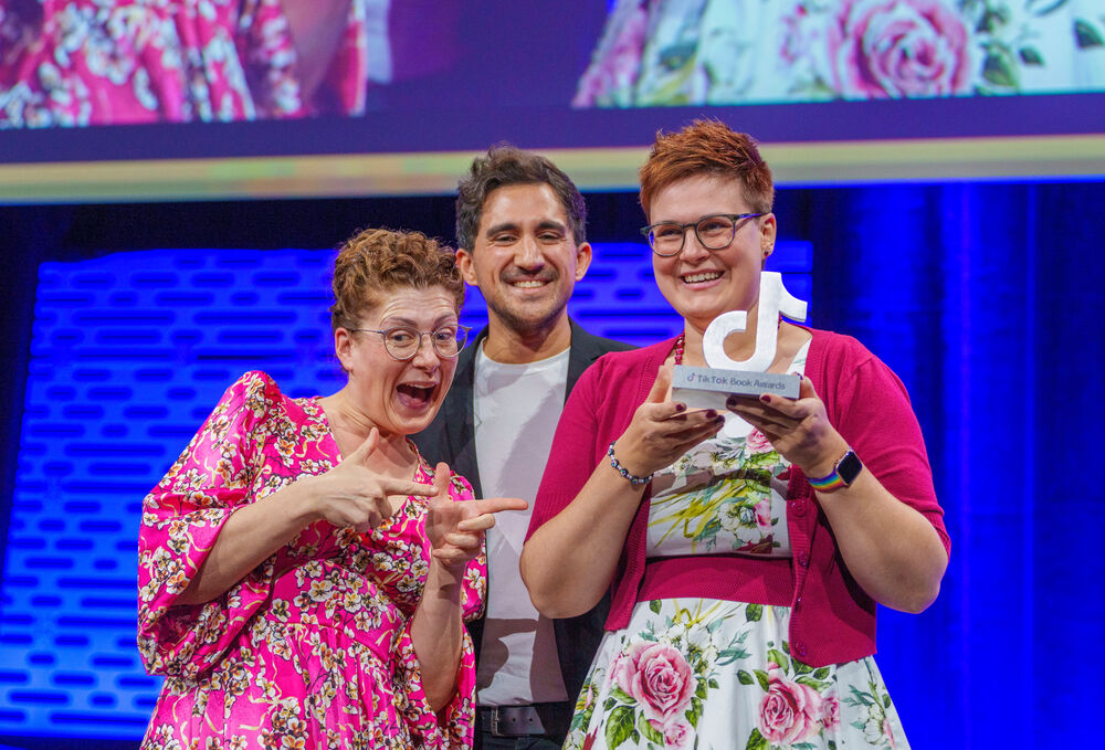 Award-Show auf der Messe: Sarah Natusch von der Buchhandlung Hoffmann aus Eutin (r.) mit Autorin Jana Crämer und Karsten Samland (TikTok).