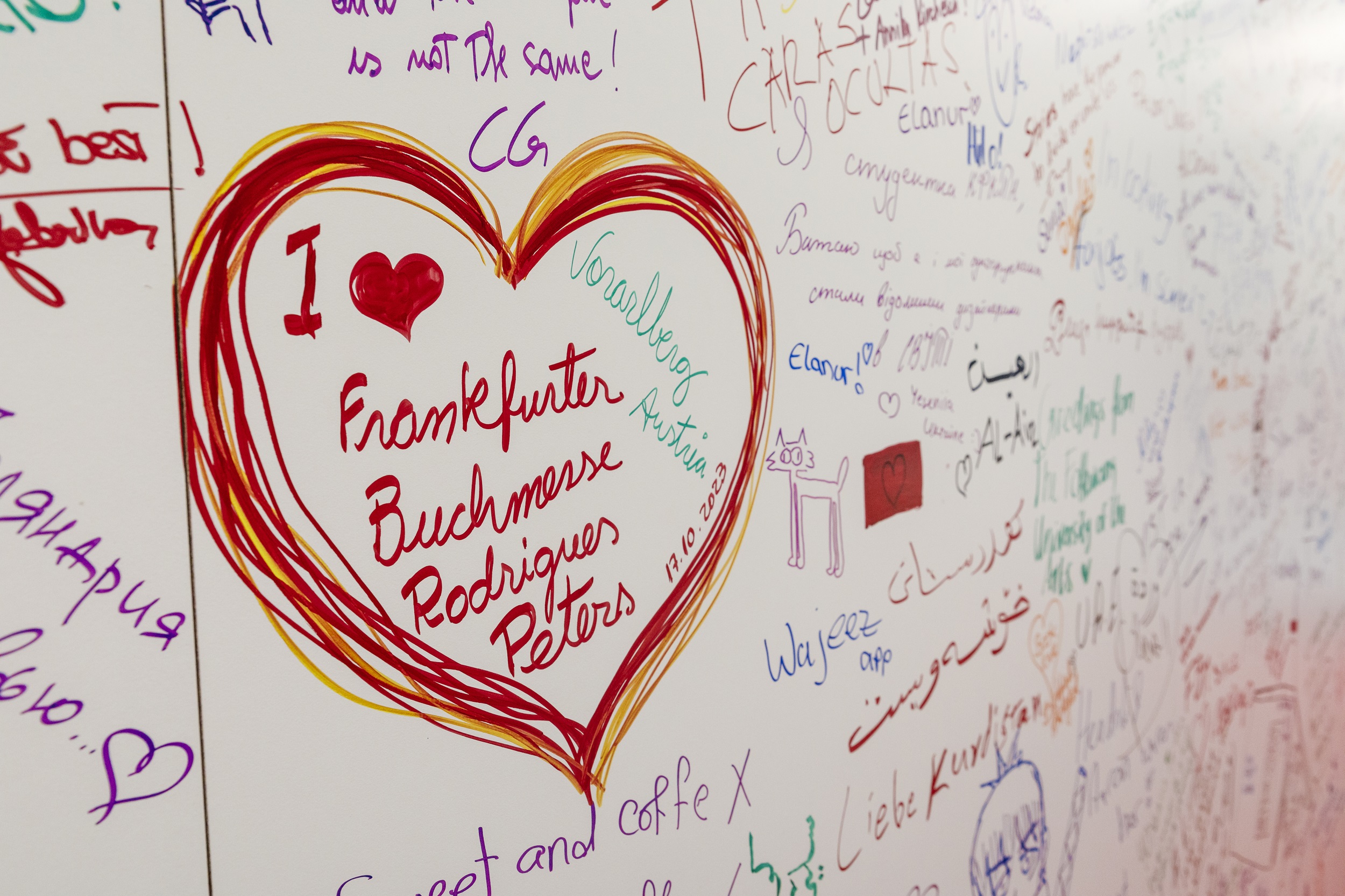 Bild für Bild können Sie an dieser Stelle die Ereignisse auf der Frankfurter Buchmesse verfolgen. Die Links in den Beschreibungen führen Sie zu den (Hintergrund-) Berichten über Bücher, Begegnungen, Debatten.