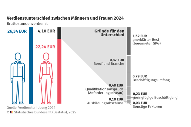 Die verbleibenden 37 % des Verdienstunterschieds (1,52 Euro von 4,10 Euro) können nicht durch die im Schätzmodell verfügbaren Merkmale erklärt werden, so Destatis: Dieser unerklärte Teil entspreche dem bereinigten Gender Pay Gap von 6 %. Demnach verdienten Arbeitnehmerinnen im Durchschnitt auch bei vergleichbarer Tätigkeit, Qualifikation und Erwerbsbiografie im Jahr 2024 pro Stunde 6 % weniger als ihre männlichen Kollegen (westliche Bundesländer: 6 %, östliche Bundesländer: 8 %).