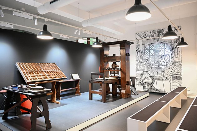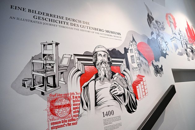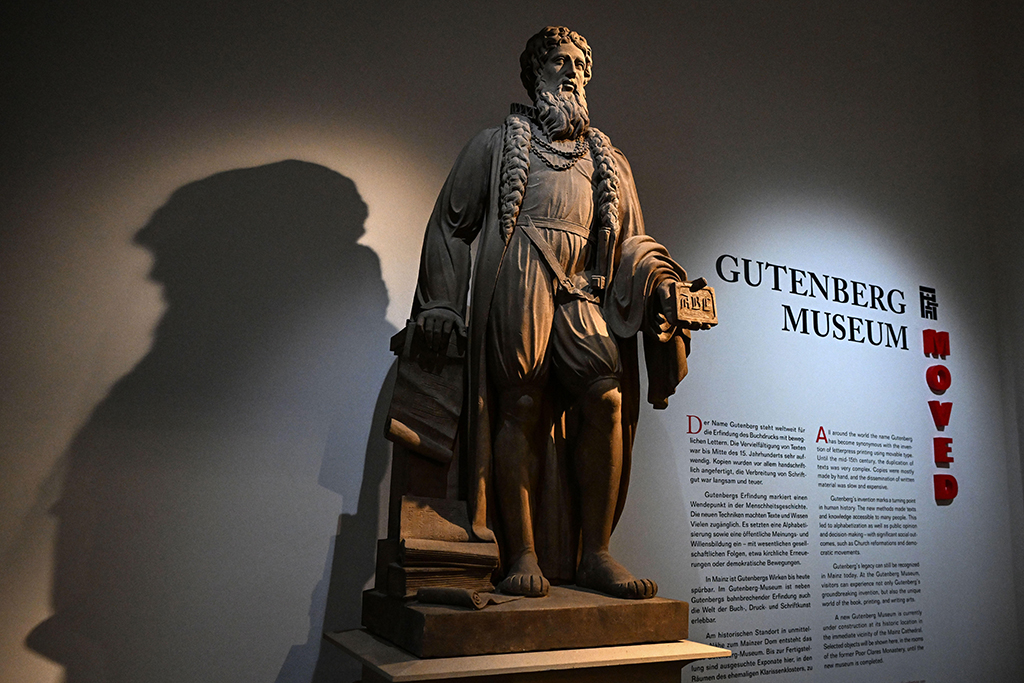 Die neue Ausstellung erstreckt sich über drei Ebenen, sie beginnt mit der im Jahre 1827 von Joseph Scholl errichteten Statue von Johannes Gutenberg.