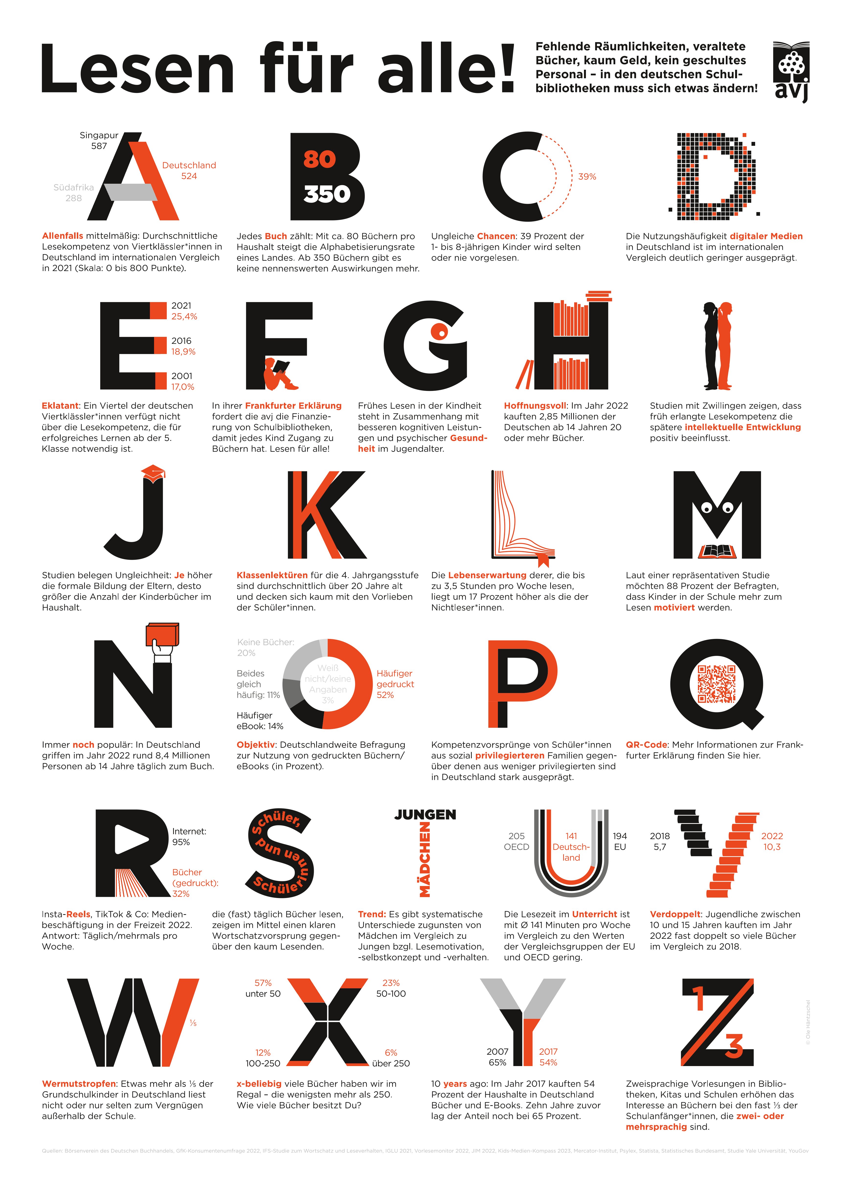 "Explizit bedeutet das für uns, dass die öffentliche Hand Gelder für Schulbibliotheken bereitstellt, um diese zu einem attraktiven Ort für Kinder zu machen. Die avj fordert zudem die Einführung einer verbindlichen (Vor-)Lesezeit in Schulen und Kitas und gezielt wirksame Förderprogramme für leseschwache Kinder, die keinen schnellen und einfachen Zugang zu Literatur haben," so Barbara Müller, Geschäftsführerin der avj.