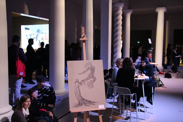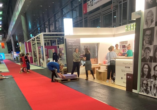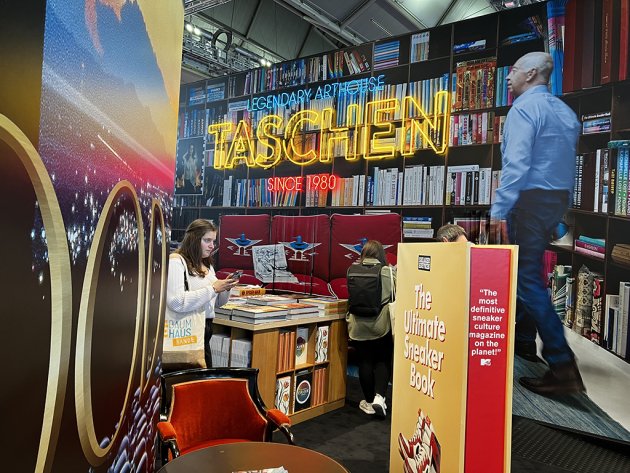 Das ist der Taschen-Verlag seinem Image schuldig: Der Verlagsstand leuchtete mit opulenten Bildbänden zum Blättern. Benedikt Taschen läuft durchs Bild, Tochter Marlene Taschen richtete einen Empfang aus.