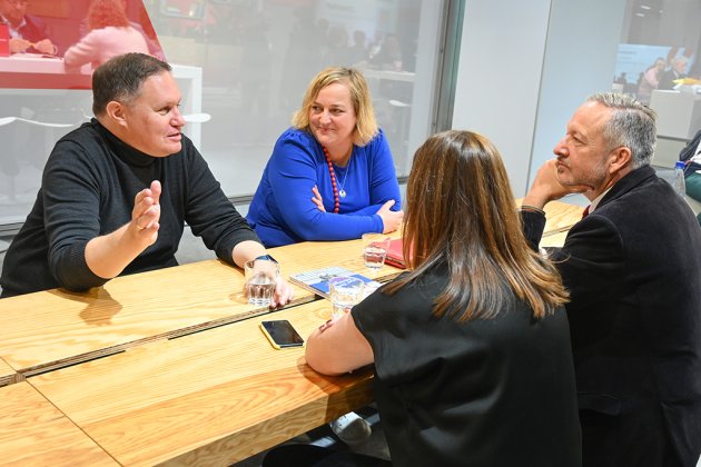 Medienbischof Volker Jung, Mitglied des Rates der Evangelischen Kirche in Deutschland (EKD), ist jedes Jahr zu Gast beim Börsenverein. Vorsteherin Karin Schmidt-Friderichs ist mit Jung, Ariadne Klingbeil (GEP) und weiteren Vorstandsmitgliedern des EMV im Gespräch.