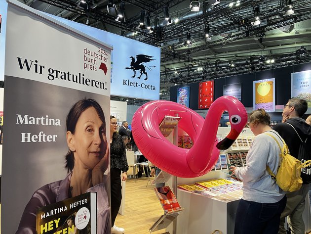 Um herauszufinden, was der Flamingo-Schwimmreifen mit dem Literaturprogramm des Verlags zu tun hat, hätte man stehen bleiben müssen. Es war aber eilig, Buchpreisträgerin Martina Hefter, Verleger Tom Kraushaar und Lektorin Katharina Körber waren auf der Leseinsel der Indies angekündigt. Das Gespräch wurde aufgezeichnet.
