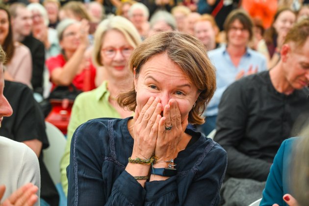 Alina Bronsky kann es nicht fassen: Ihr Buch "Pi mal Daumen" wurde zum Lieblingsbuch der unabhängigen Buchhandlungen gewählt. Die Bedeutung dieser Auszeichnung wächst, man sieht es an der Location der Veranstaltung. Im Vorjahr wurde noch in kleinerem Rahmen gefeiert, in diesem Jahr war der ganze Pavilion voller Gäste aus Buchhandel und Verlagen. Ein schöner Beweis, wie der stationäre Buchhandel Bestseller macht.