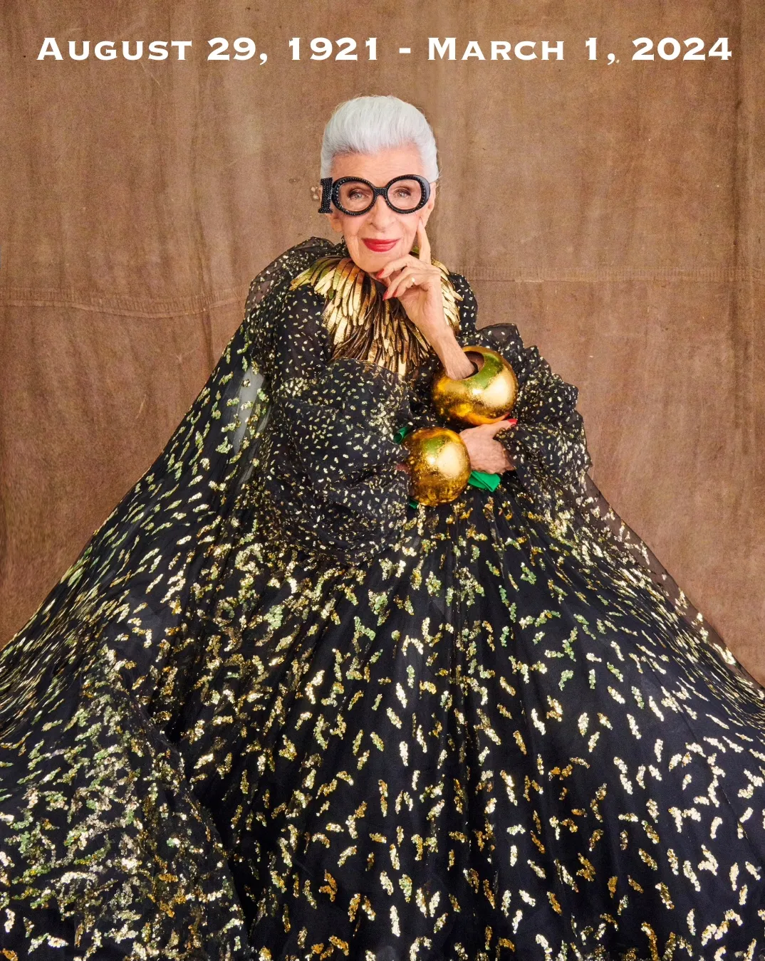 Berühmt wurde die damals 85-Jährige durch die Modeausstellung "Rara Avis: Selections from the Iris Apfel Collection", die sie aus ihrem privaten Kleider-Fundus bestückte, im Metropolitan Museum of Art in New York – ein glücklicher Zufall, sie war für eine ausgefallene Schau eingesprungen. Geboren wurde Iris Apfel am 29. August 1921 in Astoria, Queens in New York. Sie studierte Kunstgeschichte, zusammen mit ihrem Mann Carl Apfel gründete sie das Textilunternehmen Old World Weavers, gestaltete als Innenarchitektin das Weiße Haus von neun US-Präsidenten um.
