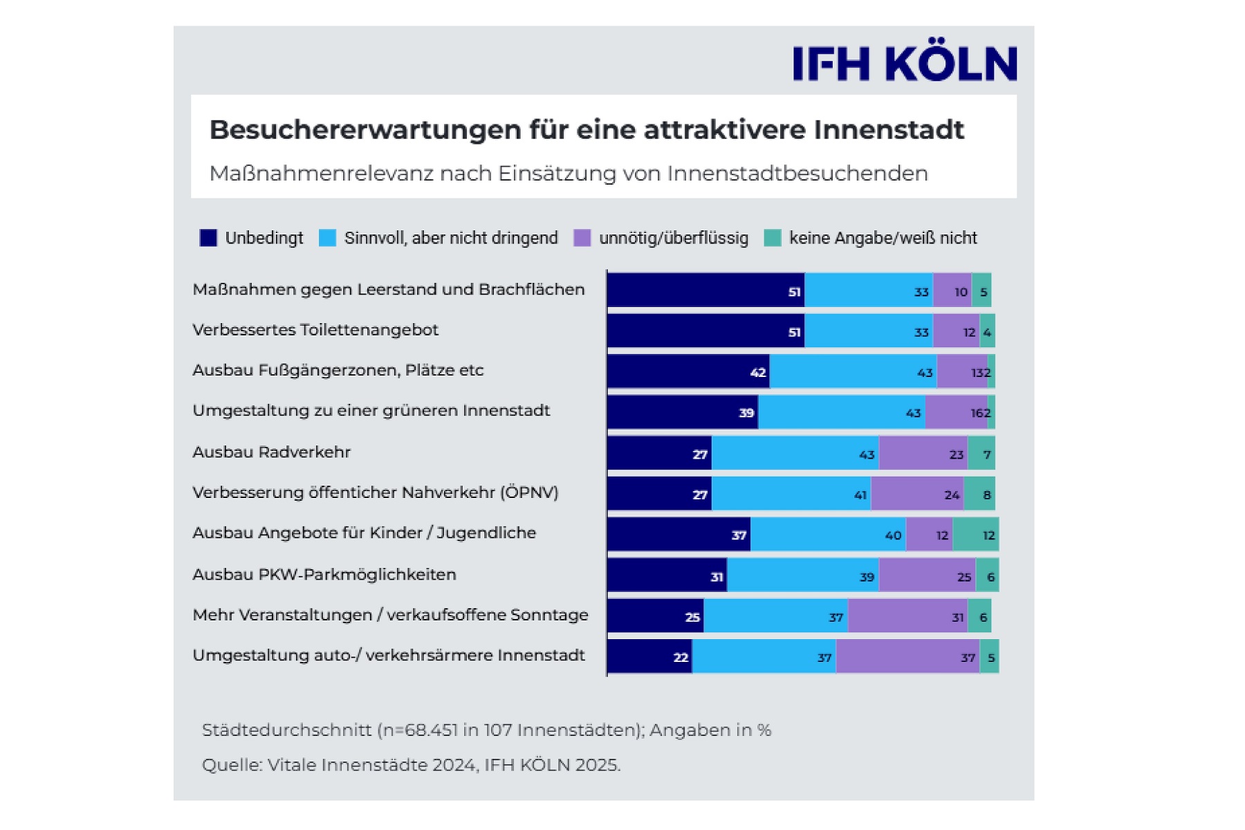"Für eine Vitalisierung der Innenstädte ist bei den richtigen Erfolgsfaktoren anzusetzen – und dabei zwischen Basis- und Attraktivitätsfaktoren zu unterscheiden. Bei allen berechtigten Zielen rund um Natur, Soziales und konsumfreie Bereiche bleibt die Frage, wie das Ganze finanziert wird. Es braucht aktuell neue Allianzen, um lokale Vitalisierung kapitalgestützt zu meistern. Vor diesem Hintergrund muss das gesamte Ökosystem Innenstadt gegenüber neuen Investoren noch aufgeschlossener werden. Schnellen Erfolg hat, wer als erstes bei den größten Pain Points der Innenstadtbesucher:innen anpackt – bei Leerstand und Ladensterben", so Boris Hedde, Geschäftsführer IFH Köln.