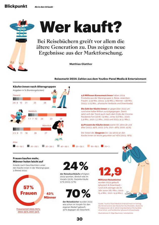 Die Soziodemografie der Käufer:innen von Reisebüchern im Jahr 2024 (physisch und Downloads) hat das YouGov Panel Media & Entertainment exklusiv für das Börsenblatt ermittelt. Ein Ergebnis: Es haben weniger Menschen als im Vorjahr ein Reisebuch (Warengruppe 3) erworben.