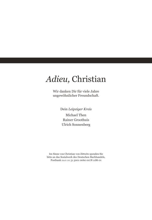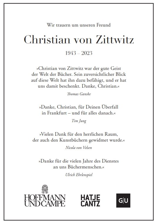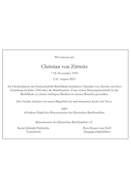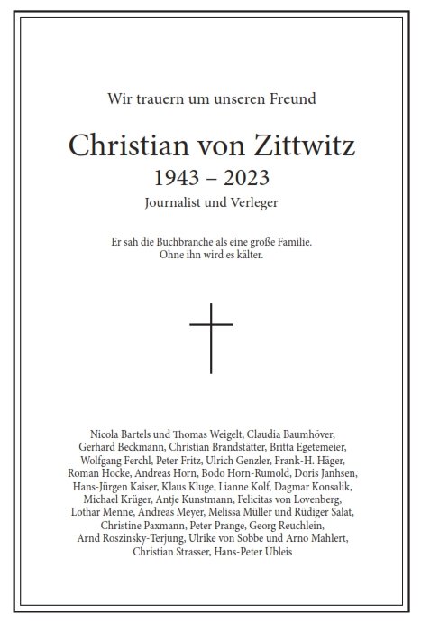Die Liebe, deren wichtigste Basis Selbstliebe und Empathie seien, habe für Christian von Zittwitz in seinem ganzen Leben eine wichtige Rolle gespielt, führte die Pastorin aus. Seine erste große Liebe habe er mit 22 Jahren gefunden, als er den „BuchMarkt“ gegründet habe – bis zu seinem Tod sei er in der Branche tätig und für alle erreichbar gewesen. Für das, was er tat, sei er immer und bis zuletzt voller Leidenschaft gewesen: „All you need is love.“