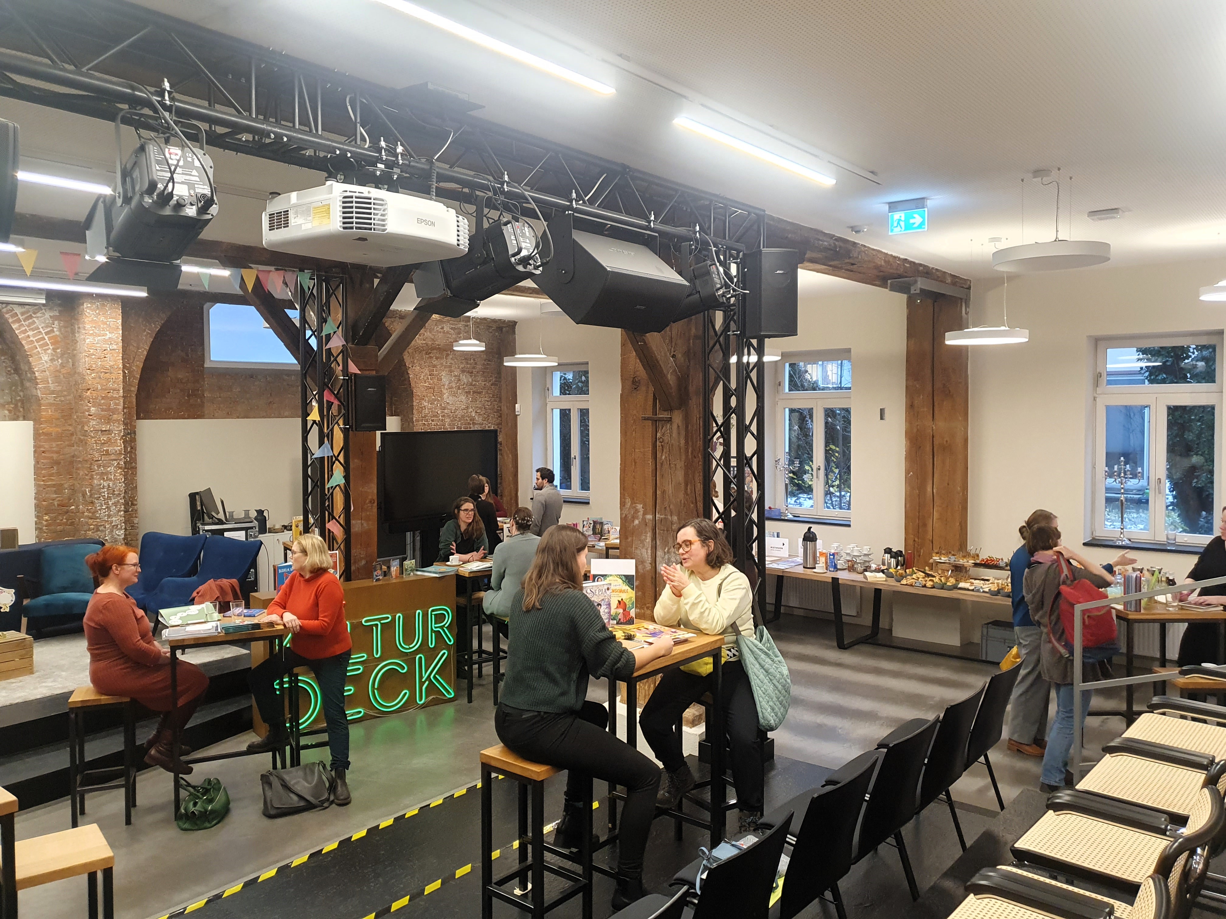 Bei Häppchen und Getränken stellten die Kolleginnen der teilnehmenden Verlage ihre jeweiligen Frühjahrsprogramme für 2024 vor. Erstmals fand die Pressebörse im Oetinger Kulturdeck, dem Theater- und Veranstaltungsraum der Verlagsgruppe Oetinger statt.