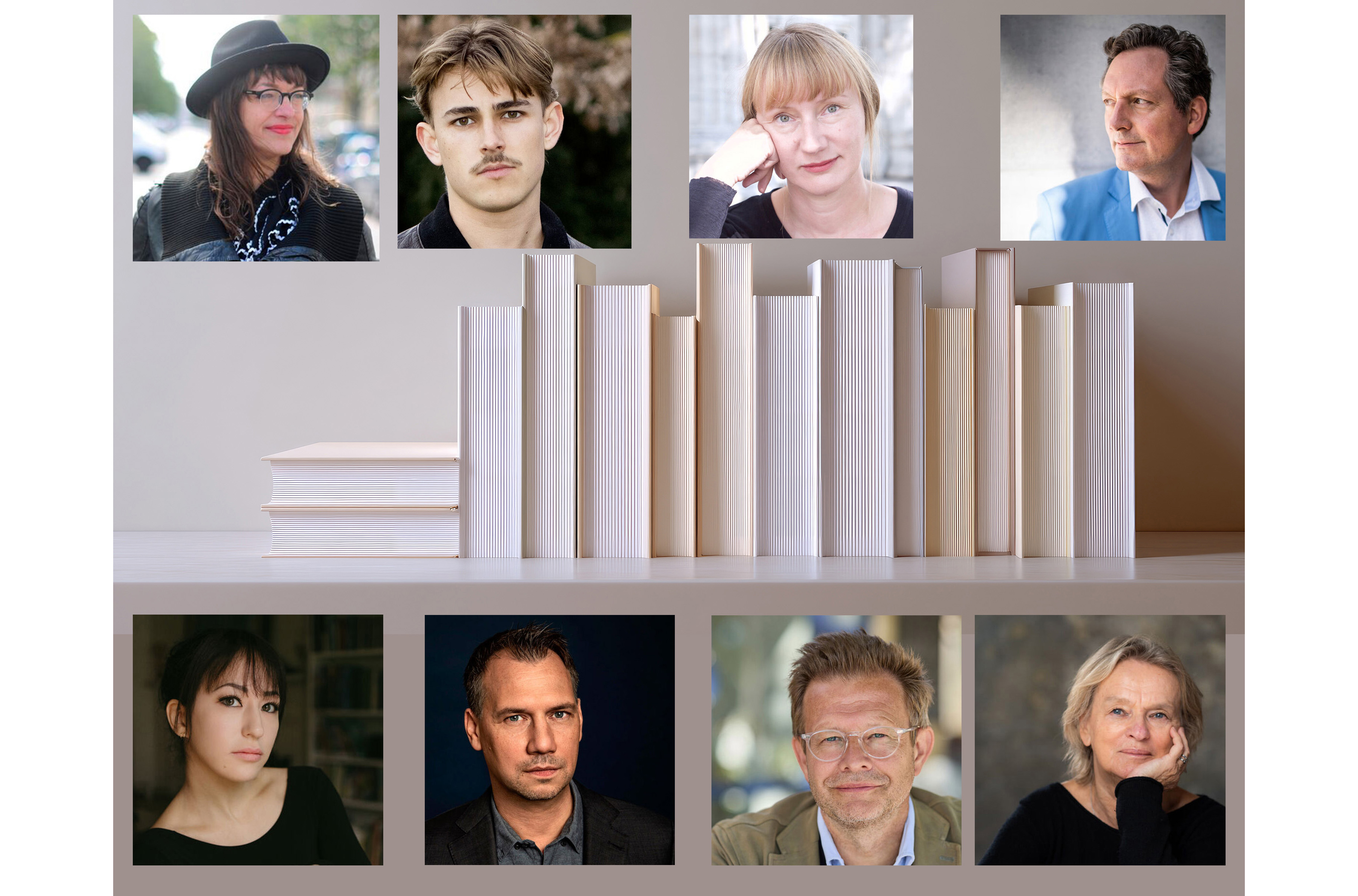 Ulli Lust, Nelio Biedermann, Kristine Bilkau, Eckart v. Hirschhausen, Elke Heidenreich, Florian Illies, Sebastian Fitzek und SenLinYu (von oben links im Uhrzeigersinn)
