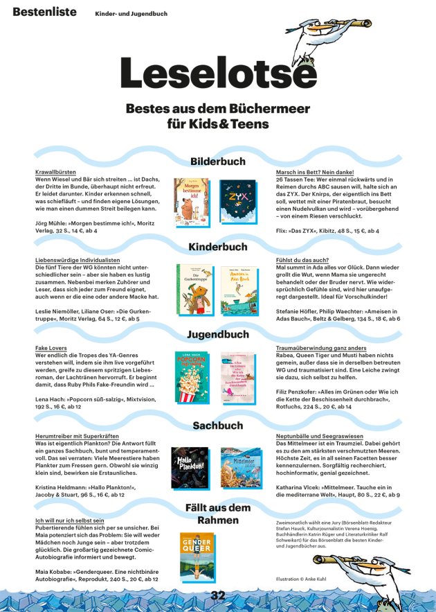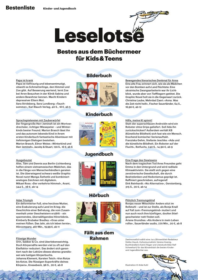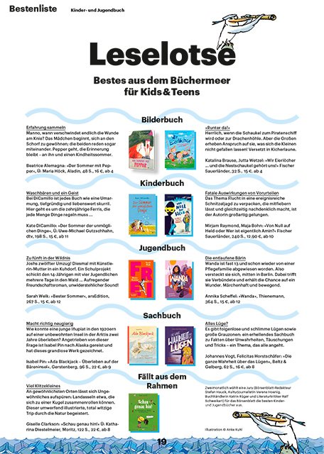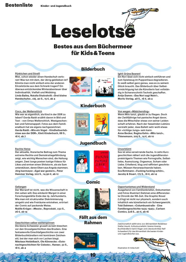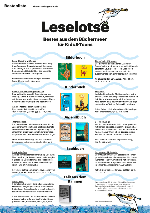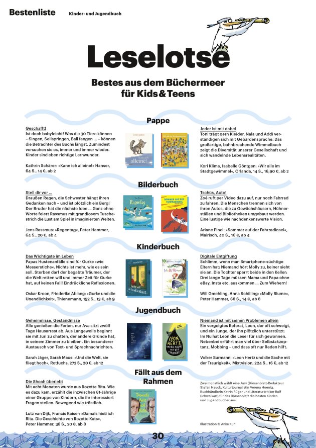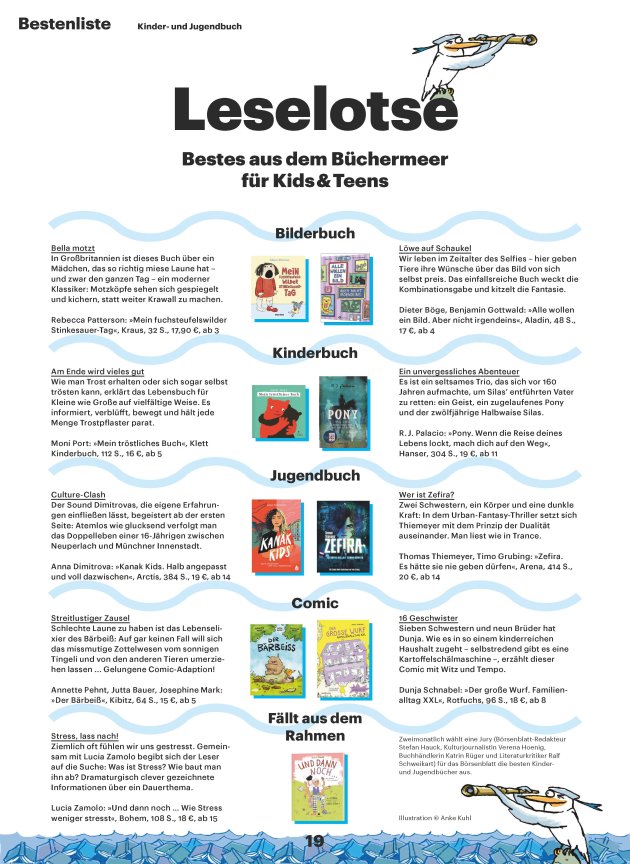Etwa 8000 Novitäten für Kinder und Jugendliche kommen jedes Jahr auf den Markt. Für Orientierung sorgt der Börsenblatt-Leselotse, der alle zwei Monate erscheint. Hier können Sie alle 6 Ausgaben eines Jahres zusammen mit einem Klick herunterladen.