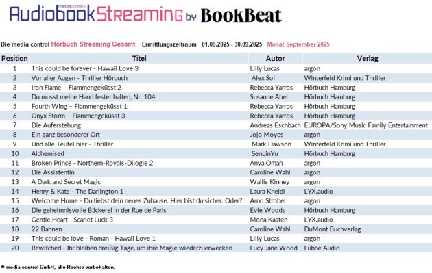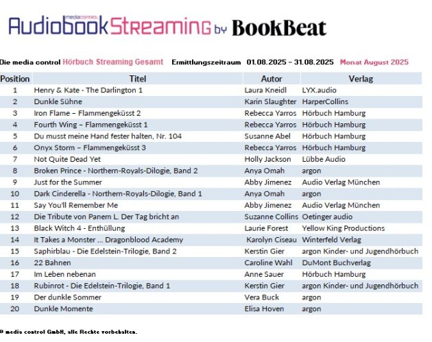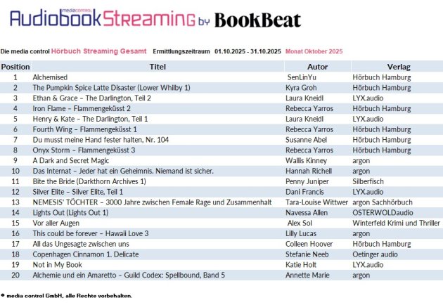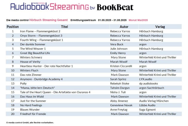 "Freiheit" ist das einzige Sachbuch in der Top-20-Liste, die von New Adult und Romantasy dominiert wird. Lena Kiefer beispielsweise ist mir den Hörbüchern ihrer drei "Coldhart"-Bände (Plätze 7, 13 und 14 – alle LYX audio) vertreten. Dreimal dabei ist auch Annette Marie mit drei Bänden ihrer "Spellbound"-Reihe (Plätz 9, 18 und 20 – alle Argon Verlag). Auf zwei Platzierungen kommen Lilly Lucas und Liane Mars. Daneben schaffen es zwei Krimi-Hörbücher in die Charts.