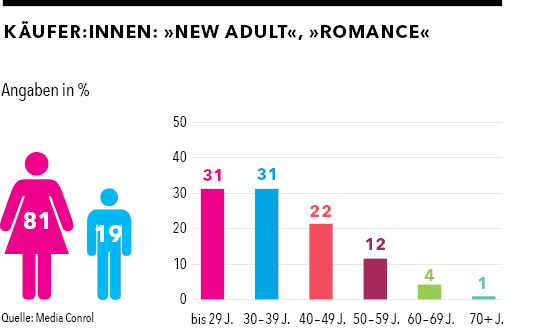 Mit 81 Prozent hatten Frauen im Zeitraum 1. Oktober 2022 bis 26. März 2023 den weitaus größten Anteil an den Käufer:innen der Genres "New Adult" und "Romance". Das hat Media Control mit seinem Analysetool "Consumer Insights" ermittelt – zudem haben die Marktforscher eine Top 25 der meistverkauften Titel erstellt. Basis für beides waren die Warengruppen 1 (Belletristik) und Jugendbuch (26), die Media Control für die genannte Periode nach den Schlagworten "New Adult" und "Romance" gefiltert hat.