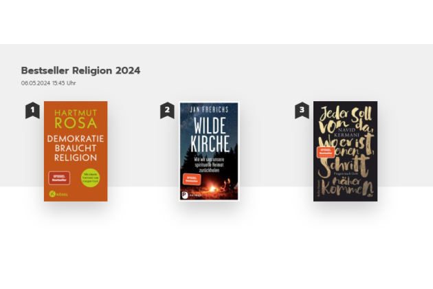 Auf Platz 1 steht Hartmut Rosas Analyse "Demokratie braucht Religion", in der der Soziologe prüft, was die Gesellschaft und die Demokratie verlieren würden, wenn die Religion keine Rolle mehr spielt. Der Longseller ist im Oktober 2022 bei Kösel erschienen, liegt aktuell in zehnter Auflage vor. In unseren Jahrescharts 2023 Sachbuch Taschenbuch holte er Platz 15.