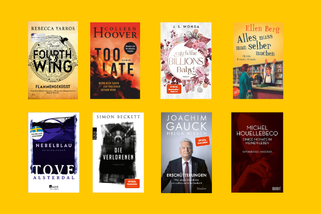 Einziger Neueinsteiger in der gleichen Liste ist Romance-Kollegin Colleen Hoover mit „Too Late – Wenn Nein sagen zur tödlichen Gefahr wird“ (ebenfalls dtv) auf Platz 13. Es ist die Neuausgabe des 2016 erschienenen Romans, der vom Verlag als „Lieblingstextversion der Autorin“ beworben wird, neue Szenen und neue Plot-Twists sowie ein neues Cover enthält. Mit Michelle Landau, Urban Hofstetter und Alexander Gerald Wagner waren drei neue Übersetzer:innen beteiligt.