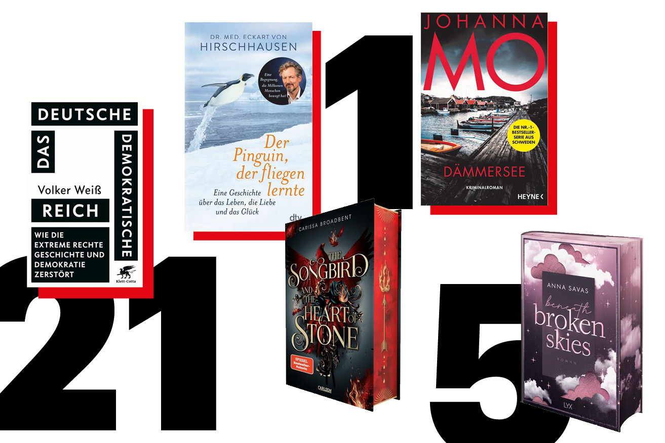 Ein wichtiges Sachbuch kommt neu auf Platz 21 in die Hardcover-Liste: "Das Deutsche Demokratische Reich – Wie die extreme Rechte Geschichte und Demokratie zerstört" (Klett-Cotta; ET: 15. Februar) von Volker Weiß. Im Februar steht es auf Platz 1 der Sachbuchbestenliste von Deutschlandfunk Kultur, ZDF und DIE ZEIT und führt diese nach Punktzahl deutlich an. "Der Historiker Volker Weiß analysiert, wie AfD und Co. die Vergangenheit uminterpretieren, um die Gegenwart zu verändern. Ihr Ziel: Eine Synthese vergangener autoritären Systeme, hin zu einem 'Deutschen Demokratischen Reich'", heißt es dort zum Buch.