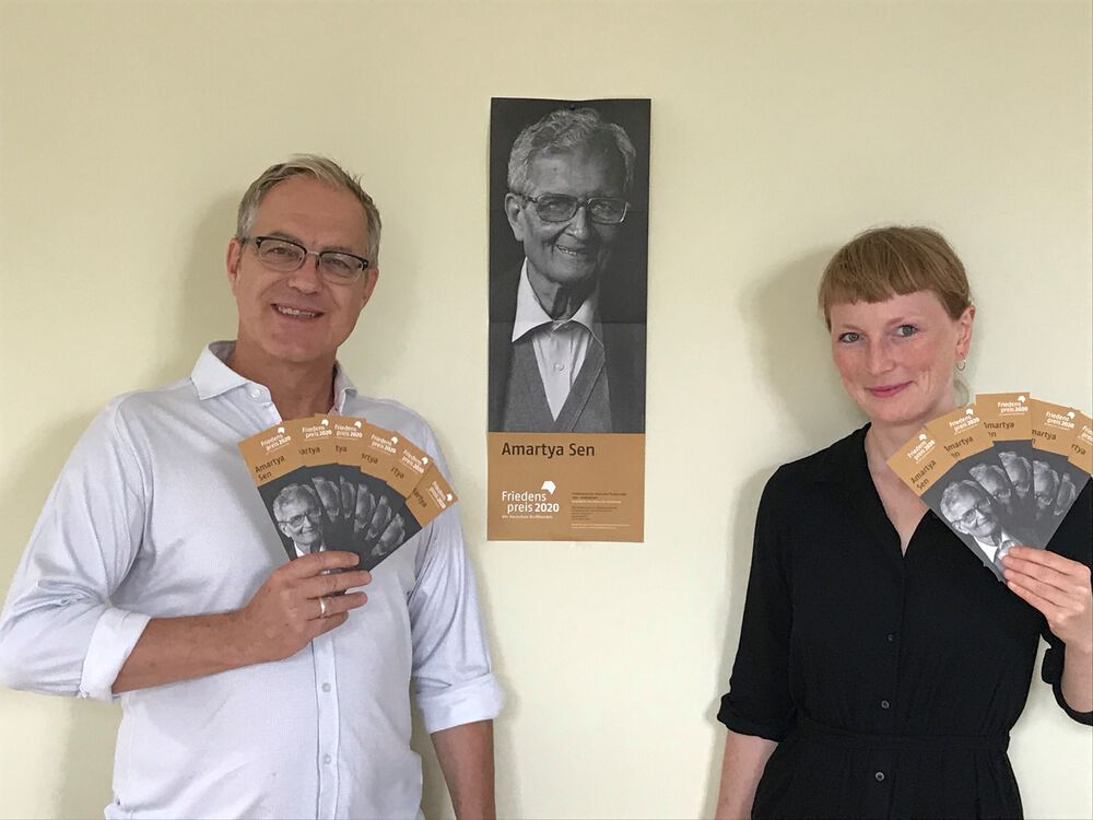 Die Verlage haben erkannt, wie wichtig es ist, Amartya Sens Werk dem deutschsprachigen Publikum nahezubringen. C. H. Beck plant Neuausgaben und veröffentlicht im Oktober ein neues Buch über die Möglichkeiten, eine gerechte Welt zu erschaffen. Reclam publiziert zwei weitere wichtige Vorträge, und auch Hanser legt ein vor 20 Jahren erschienenes Werk über ökonomische Ungleichheit noch einmal neu auf, da es weiterhin hochaktuell ist. Wir haben wie in den Jahren zuvor ein Lesezeichen und einen Infoflyer produziert, der sich auch als Plakat verwenden lässt. Beides können Buchhändler*innen kostenlos bei uns bestellen und an Kunden weitergeben.