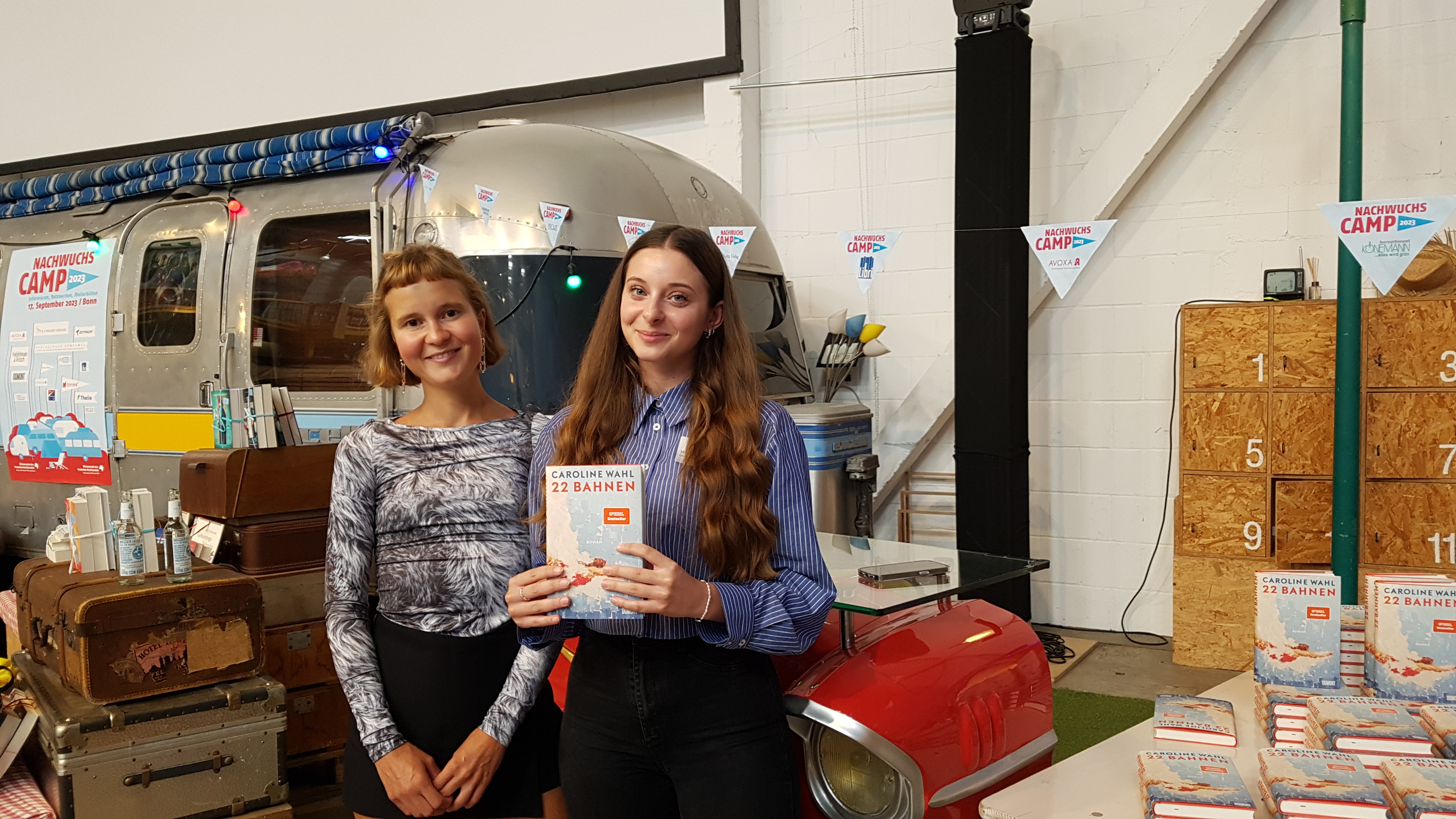 Neben diesem wertvollen Erkenntnisgewinn hatte das NachwuchsCamp aber noch sehr viel mehr zu bieten. Ein persönliches Highlight war die Lesung von Bestsellerautorin Caroline Wahl aus ihrem Debütroman "22 Bahnen". Darauffolgend stand die Autorin für eine Signier- und Fragerunde zur Verfügung, sodass ich die Autorin kennenlernen durfte und ein signiertes Buch sowie neue Impulse mit nach Hause nehmen konnte. Zudem gab es eine große Bücher-Tombola, in deren Rahmen liebevoll geschnürte Buchpakete an alle Teilnehmer*innen verlost worden sind. All dies war eingebettet in eine traumhafte, einmalige Location, den Indoor-Campingplatz BaseCamp in Bonn.