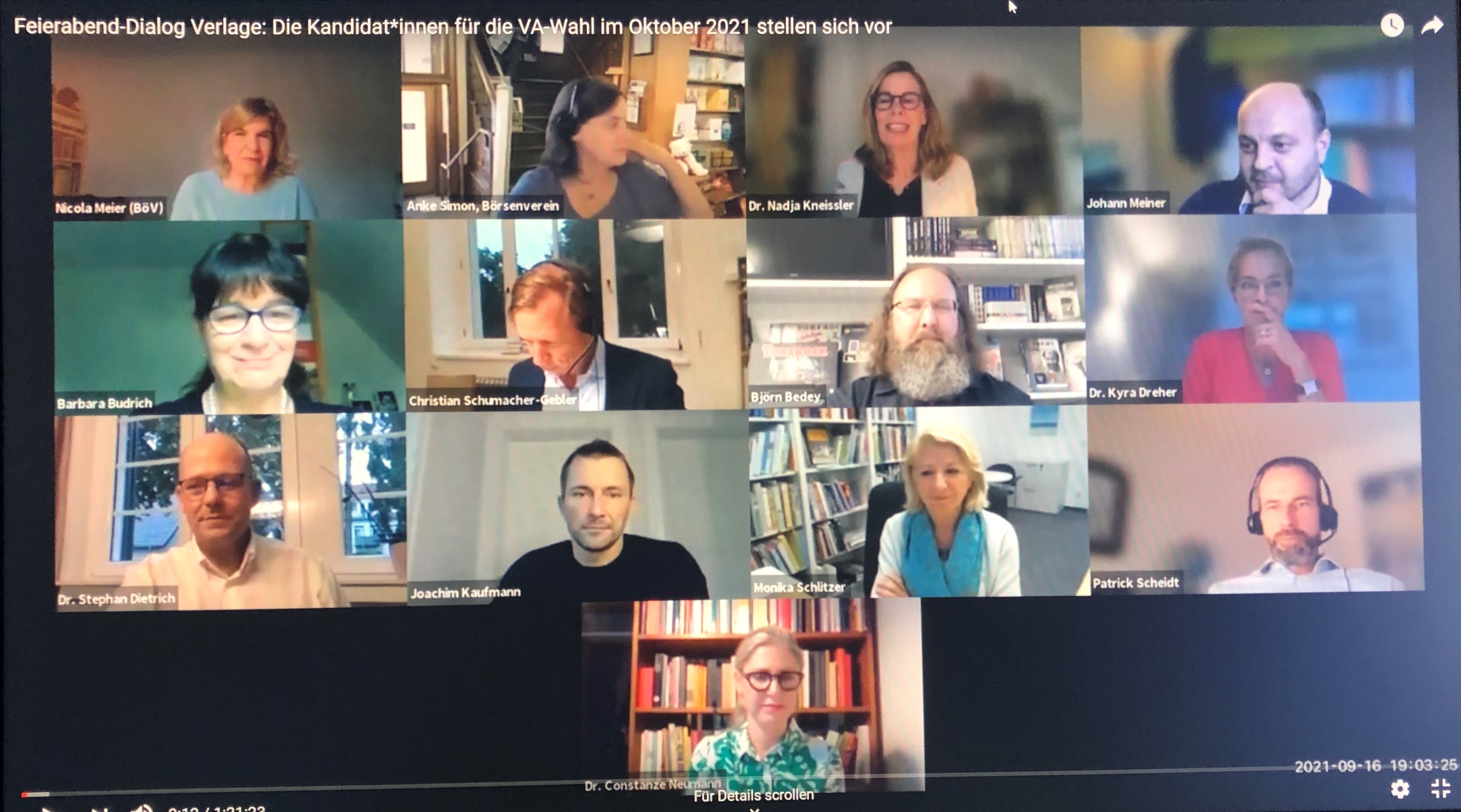 Nachdem sich am 15. September die Kandidat*innen für den Sortimenter-Ausschuss bei einem digitalen "Feierabend-Dialog" präsentierten, waren am 16. September die Bewerber*innen für den Verleger-Ausschuss an der Reihe.