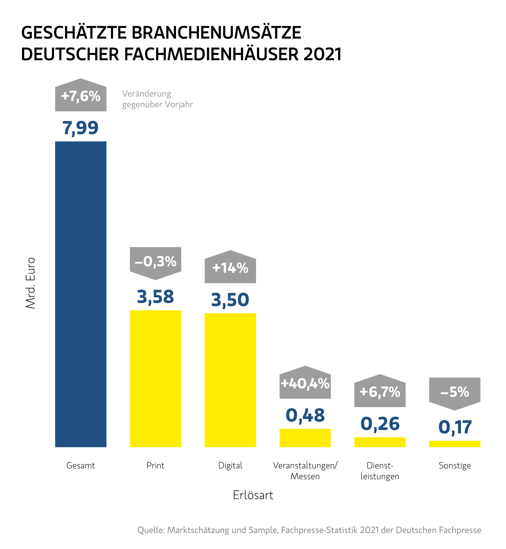 2021 erwirtschaftete die Fachmedienbranche der Statistik zufolge einen Gesamtumsatz von 7,99 Milliarden Euro. Im Vergleich zum Vorjahr entspricht dies einem Wachstum von 560 Millionen Euro beziehungsweise 7,6 Prozent.