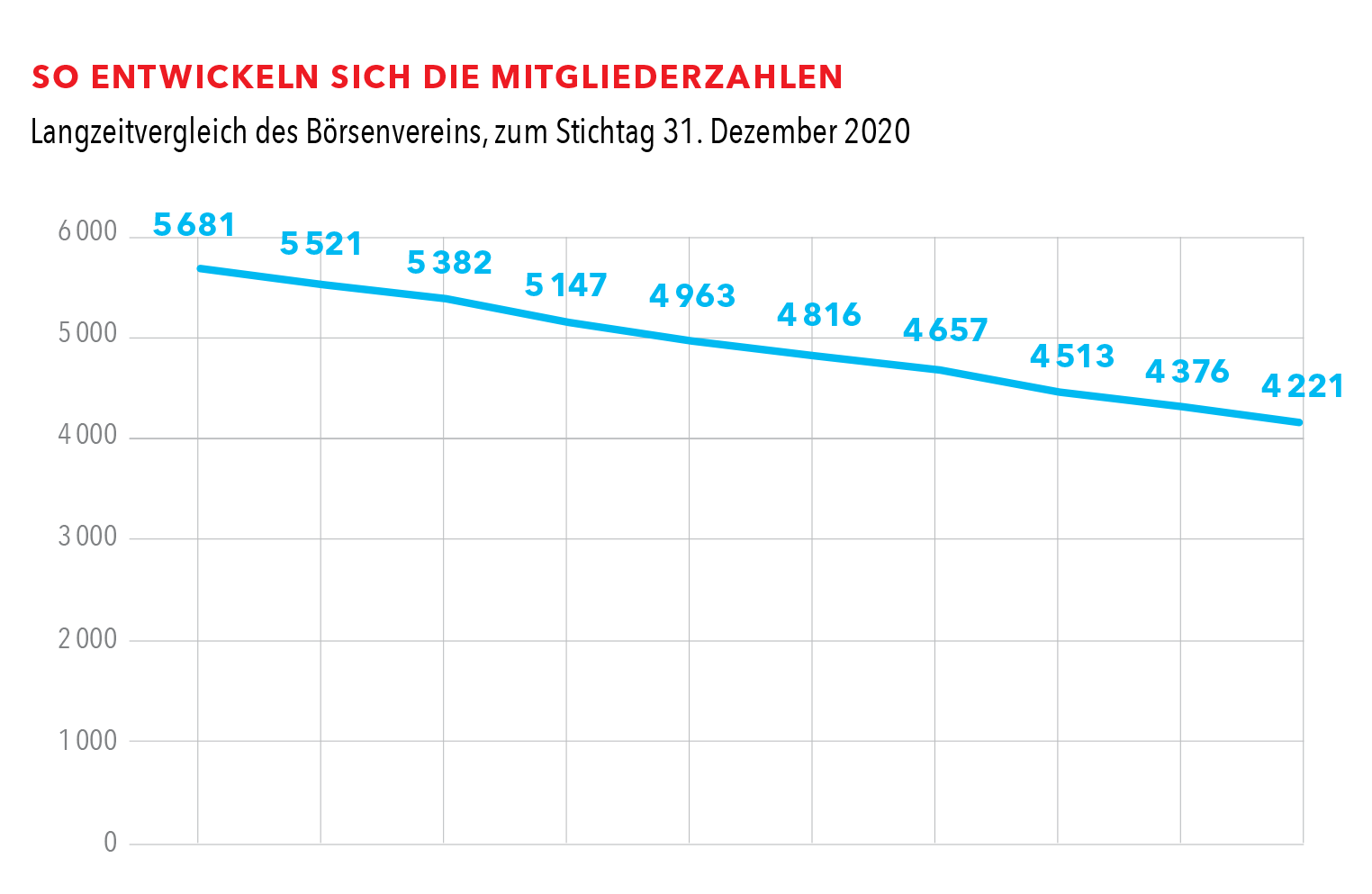 Zum 31. Dezember 2020 zählte der Verband exakt 4 221 Mitglieder. Das sind 155 Firmen weniger als zum Stichtag des Vorjahres (minus 3,5 Prozent, 2019: minus 3,0 Prozent, 2018: minus 3,1 Prozent). Der seit Jahren anhaltende Abwärtstrend (siehe Grafik) hat sich damit etwas beschleunigt – eine dramatische Zuspitzung speziell durch die Corona-Krise lässt sich aus den Zahlen für 2020 jedoch nicht herauslesen.