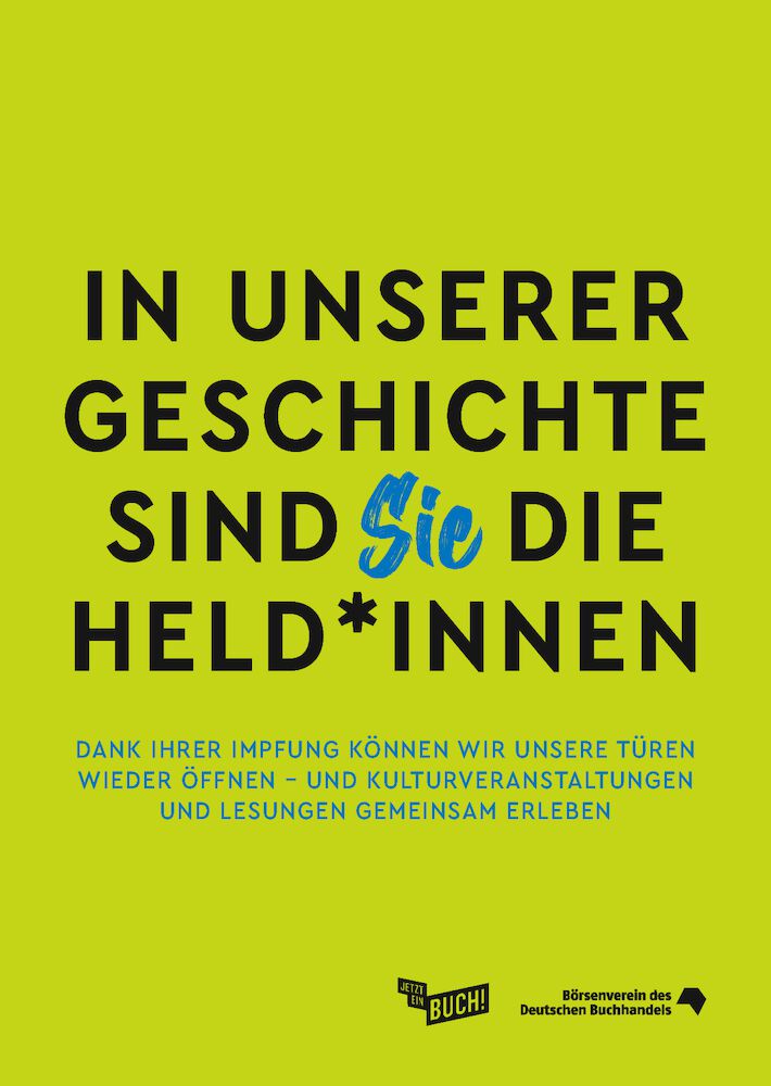 Beratung und Austausch im Laden, gemeinsame Lesungen und Kulturveranstaltungen vor Ort sind durch die Vielzahl der Impfungen langsam wieder möglich. Deshalb bietet der Börsenverein dem Buchhandel jetzt die Gelegenheit, sich mit Plakaten und Social-Media-Motiven bei seinen Kund*innen zu bedanken – für den Zusammenhalt in schwieriger Zeit und die Bereitschaft, sich impfen zu lassen. Natürlich können die Motive der Initiative »Jetzt ein Buch!« ebenso von Verlagen genutzt werden, um ein Dankeschön an Leser*innen zu senden.