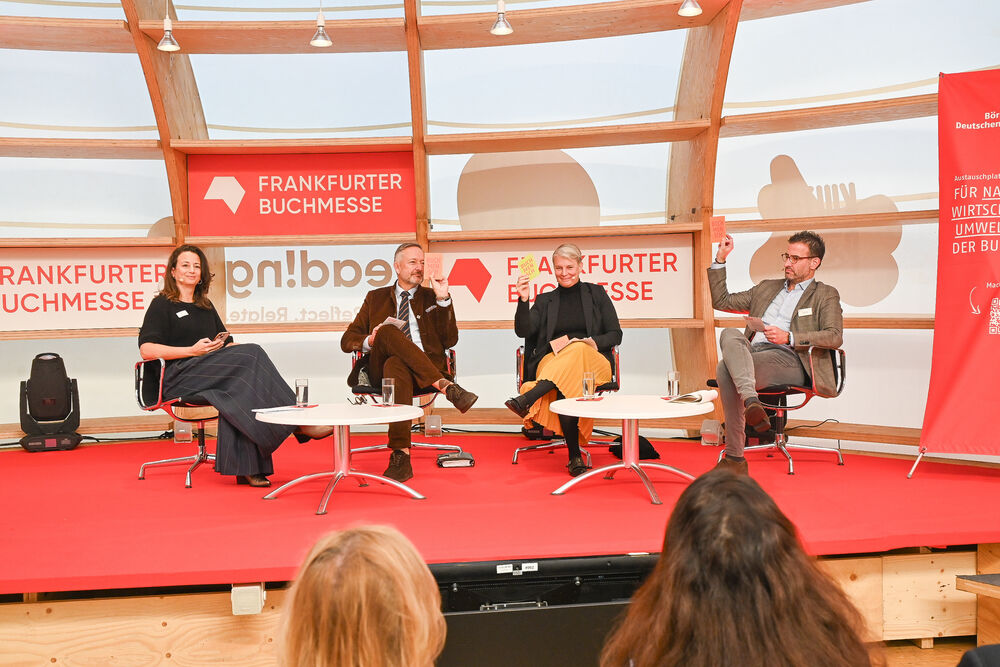 Als Warm-up machte Moderatorin Mariam En Nazer (Sprecherin der IG Nachhaltigkeit und Production and Sustainability Managerin bei Penguin Random House) ein kleines Spiel mit den Podiumsgästen. Mit grünen und roten Karten sollte das Trio über zentrale ökologische Branchenfragen abstimmen – etwa: